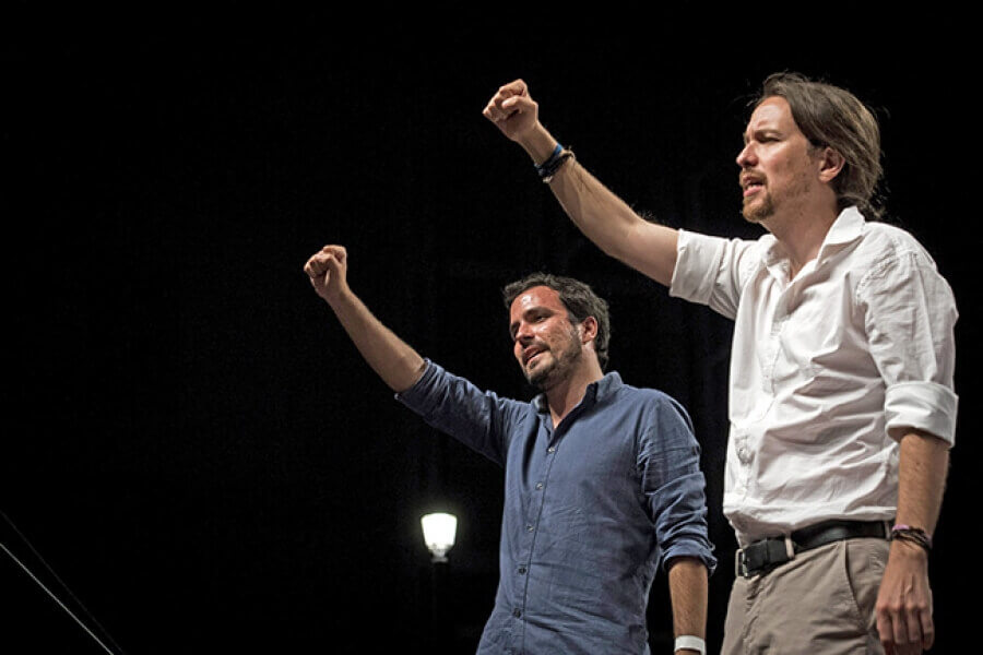 Leader of Podemos Party, Pablo Iglesias, (R), and leader of United Left political coalition, Alberto Garzon/EPA/LUCA PIERGIOVANNI