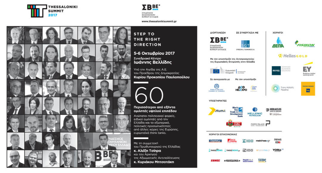 Το 2ο Thessaloniki Summit διοργανώνουν ο Σύνδεσμος Βιομηχανιών Βορείου Ελλάδος (ΣΒΒΕ), σε συνεργασία με την Συμεών Τσομώκος ΑΕ – Delphi Economic Forum. Η διοργάνωση τελεί υπό την αιγίδα του Προέδρου της Ελληνικής Δημοκρατίας, Προκόπη Παυλόπουλου και έχει τη στήριξη της Αντιπροσωπείας της Ευρωπαϊκής Επιτροπής στην Ελλάδα, σε συνεργασία με το Ελληνο-Αμερικανικό Εμπορικό Επιμελητήριο και με την υποστήριξη της ΔΕΘ-HELEXPO και του ‘Enterprise Europe Network Hellas. [ΑΠΕ-ΜΠΕ]