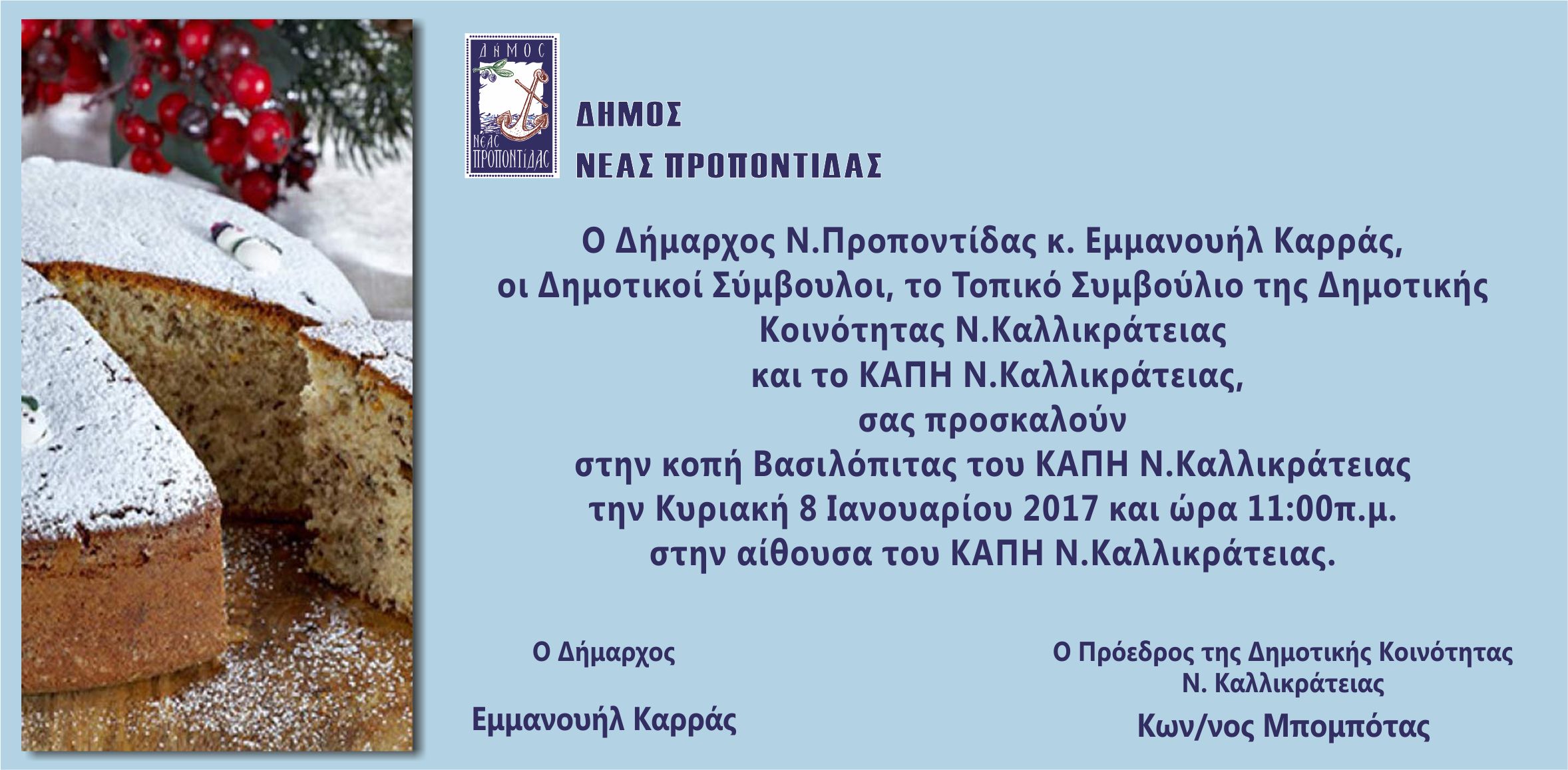 Η κοπή Βασιλόπιτας του ΚΑΠΗ Ν. Καλλικράτειας θα πραγματοποιηθεί την Κυριακή 8 Ιανουαρίου και ώρα 11:00π.μ στην αίθουσα του ΚΑΠΗ Ν. Καλλικράτειας