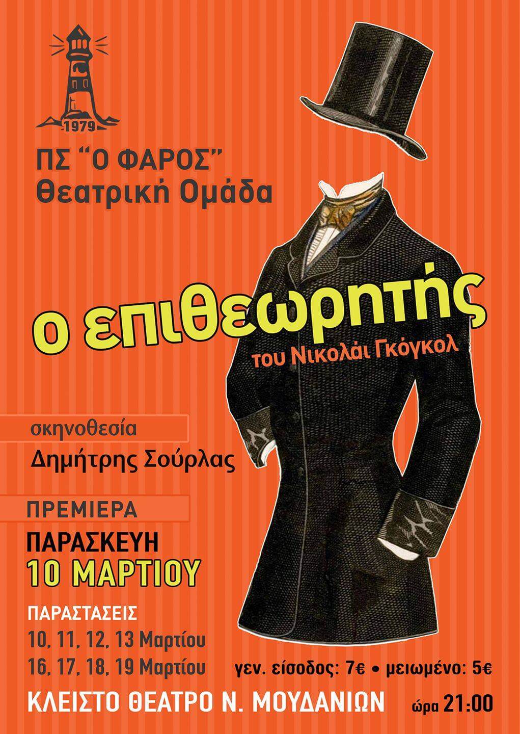 Η θεατρική Ομάδα ενηλίκων του ΠΣ «Ο ΦΑΡΟΣ» ανεβάζει την κωμωδία «Ο ΕΠΙΘΕΩΡΗΤΗΣ» του Νικολάι Γκόγκολ, μετάφραση: Λεωνίδας Καρατζάς, Λουΐζα Μητσάκου, σε σκηνοθεσία Δημήτρη Σούρλα, βοηθός σκηνοθέτη Κατερίνα Σολομωνίδου.