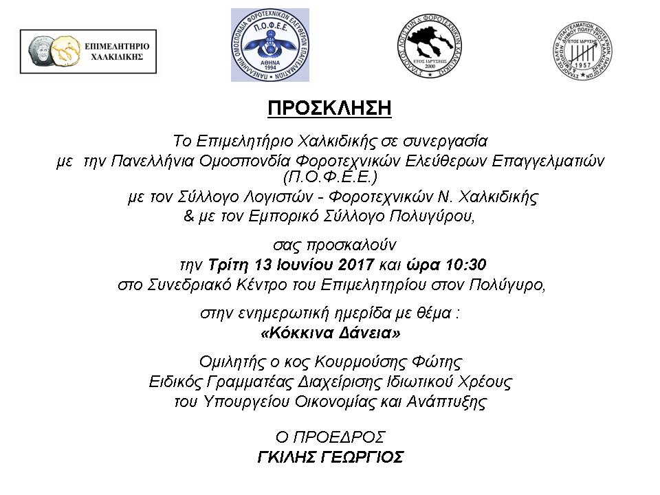 Η ημερίδα έχει θέμα «Κόκκινα Δάνεια» και θα πραγματοποιηθεί στον Πολύγυρο, την Τρίτη 13 Ιουνίου 2017 και ώρα 10:30 στο Συνεδριακό Κέντρο του Επιμελητηρίου.