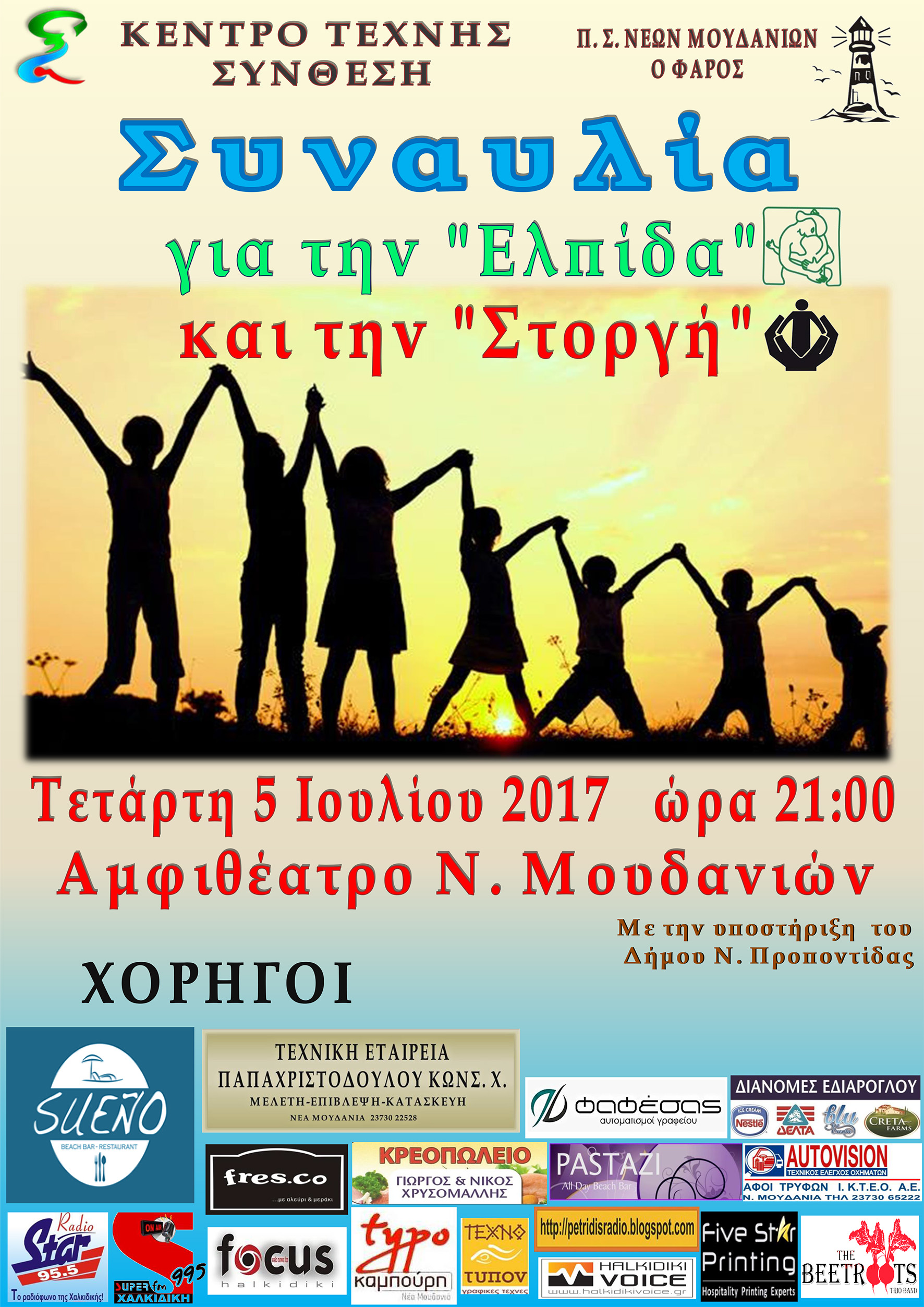 Το κέντρο τέχνης "Σύνθεση" διοργανώνει την Τετάρτη 5 Ιουλίου και ώρα 9:00 μμ. συναυλία για την "Ελπίδα" και την "Στοργή" στο αμφιθέατρο Ν. Μουδανιών με την υποστήριξη του Δήμου Νέας Προποντίδας.