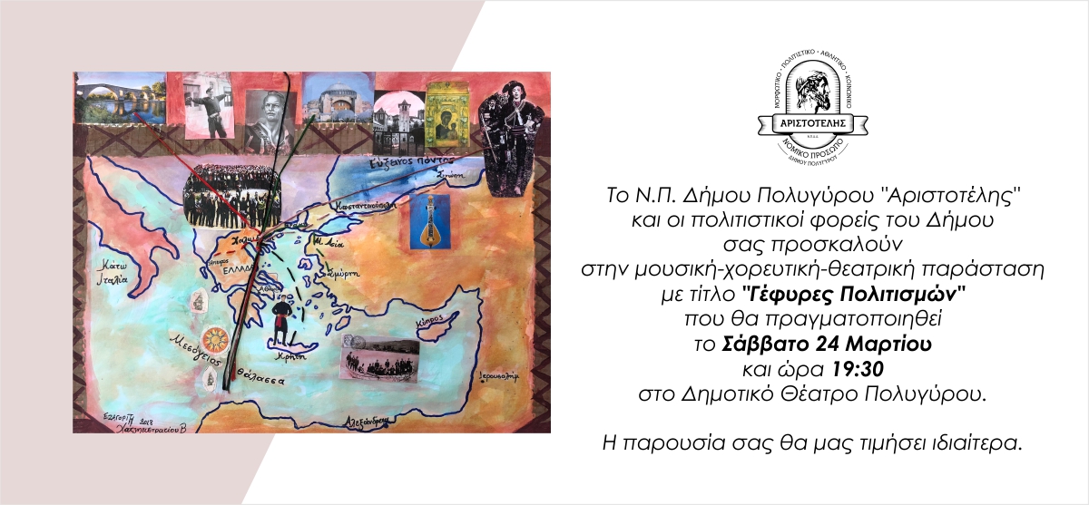 Μια πρωτοποριακή μουσική – χορευτική – θεατρική εκδήλωση με τίτλο «Γέφυρες Πολιτισμών» παρουσιάζεται στον Πολύγυρο το Σάββατο 24 Μαρτίου, στις 7.30 μ.μ., στο Δημοτικό θέατρο Πολυγύρου.