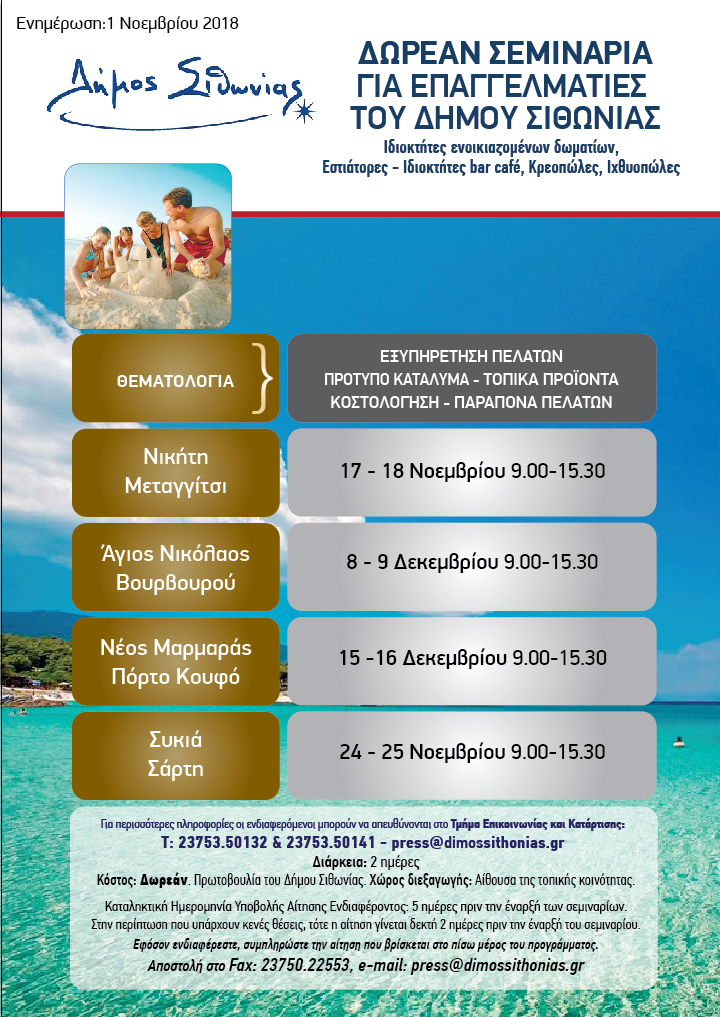 Δωρεάν επιμορφωτικά σεμινάρια για ιδιοκτήτες ενοικιαζομένων δωματίων, bar cafe, εστιάτορες, κρεοπώλες και ιχθυοπώλες θα προσφέρει ο Δήμος Σιθωνίας, στο πλαίσιο της στρατηγικής ανάπτυξης του τουρισμού στην περιοχή και σε συνεργασία με τους τοπικούς επαγγελματικούς συλλόγους.