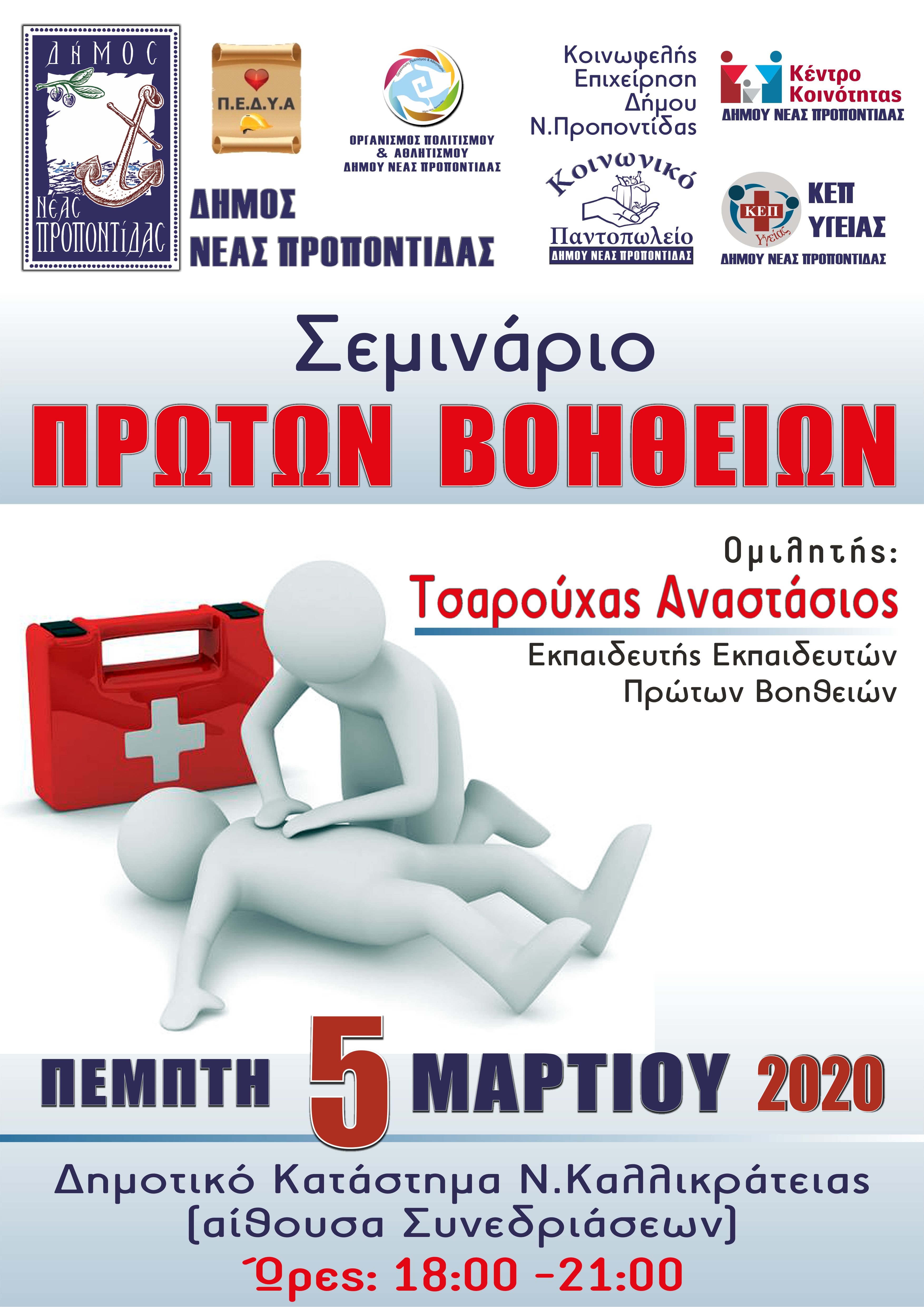 Τρίωρο σεμινάριο για τις πρώτες Βοήθειες σε συνεργασία με το Εκπαιδευτικό Κέντρο Πιστοποιημένης Εκπαίδευσης Διάσωσης Υγιεινής και Ασφάλειας (ΠΕΔΥΑ) θα πραγματοποιηθεί την Πέμπτη 5 Μαρτίου 2020 (Ώρες 18:00 έως 21:00) στο Δημοτικό Κατάστημα Ν. Καλλικράτειας. Ομιλητής θα είναι ο κ. Τσαρούχας Αναστάσιος, Εκπαιδευτής Εκπαιδευτών Πρώτων Βοηθειών.