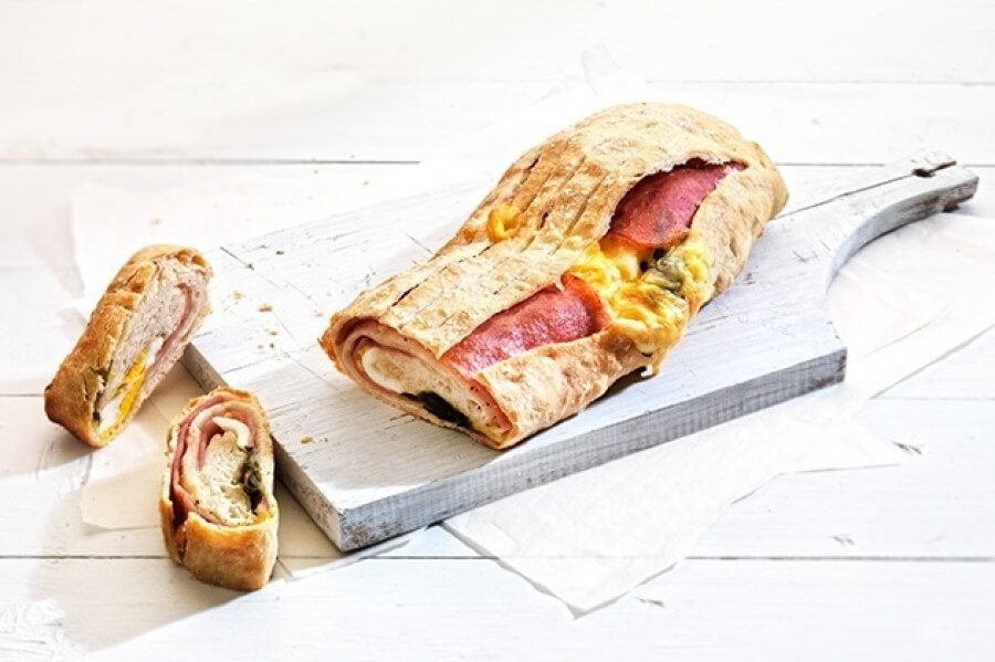 3. Διπλώνουμε τρεις φορές το φύλλο με τη γέμιση. Κόβουμε τα πλαϊνά που εξέχουν και πατάμε καλά τις ενώσεις να κλείσουν. Χαράζουμε επιφανειακά κατά μήκος το στρόμπολι σε 6-8 χαρακιές.
