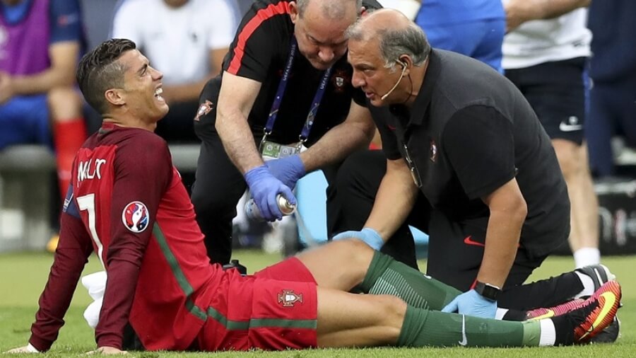 Ο Κριστιάνο Ρονάντο τραυματίστηκε στο 9ο λεπτό όταν ο Παγιέτ του έκανε φάουλ, προσπάθησε να μείνει στον αγωνιστικό χώρο. Αμέσως οι γιατροί της Πορτογαλίας του έβαλαν επίδεσμο στο αριστερό του πόδι, που κάλυψε το γόνατο και το μηρό, και επέστρεψε στο παιχνίδι, όπου έμεινε μέχρι το 25', όταν ζήτησε αλλαγή. Απομακρύνθηκε με φορείο και τον αντικατέστησε ο Ρικάνρτο Κουαρέσμα. [ΑΠΕ-ΜΠΕ]