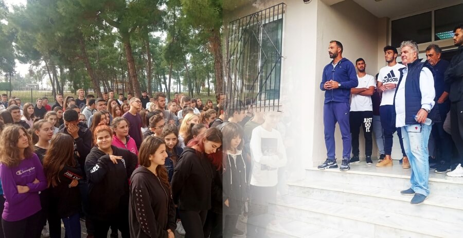Εκ μέρους της Διοίκησης της ομάδας, πρώτος πήρε τον λόγο ο Κώστας Σγουρής, ενώ ακολούθησε ο προπονητής Κώστας Γεωργιάδης, με τους χαιρετισμούς - καλέσματα αμφότερων να γίνονται δεκτοί με ενθουσιασμό από τα παιδιά που κατέκλυσαν τον προαύλιο χώρο του σχολείου! Εννοείται ότι κάτι ανάλογο συνέβη όταν ανέβηκε στο ''βήμα'' ο αρχηγός Γιάννης Μιλκούδης, εκπροσωπώντας βέβαια το σύνολο των συμπαικτών του! Το παρών έδωσε βέβαια και ο ''συνδετικός κρίκος'' Διοίκησης και ποδοσφαιρικού τμήματος Γενικός Αρχηγός Νίκος Στεφανίδης, ενώ από τους ποδοσφαιριστές ''παρουσιάστηκαν'' στο ενθουσιώδες νεανικό κοινό επίσης, οι Στάθης Σαρβανίδης, Γρηγόρης Ευθυμιάδης, Καλούδης Λεμονής, Γιάννης Ντούνγκα, Παναγιώτης Ζορμπάς, Αβραάμ Κουλπαλίδης και Φώτης Σγουρής!