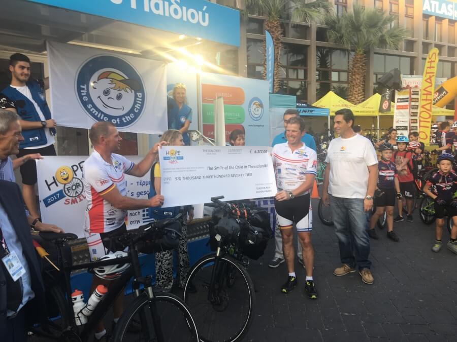 Μαζί τους, οι δύο ποδηλάτες είχαν και μια επιταγή 6.372 ευρώ, προκειμένου να την παραδώσουν στους ανθρώπους του Χαμόγελου του Παιδιού - μία από τις τέσσερις οργανώσεις, στις οποίες οι δύο φίλοι αποφάσισαν να διαθέσουν (ισόποσα) τα χρήματα που συγκέντρωσαν μ' αυτήν την πρωτοβουλία τους. Για κάθε χιλιόμετρο που διένυαν οι δύο Γερμανοί ποδηλάτες στο πλαίσιο του ποδηλατικού τους «γύρου ελπίδας για ένα χαμόγελο» (Hope for a Smile Tour) ζητούσαν απ' όσους πιστεύουν στην ανάγκη της αλληλεγγύης, να καταθέσουν ό,τι μπορούν, με στόχο να βοηθηθεί το Χαμόγελο του Παιδιού και οι οργανώσεις World Vision, Open Doors, Ev. Gemeinschaftsverein/CVJM.