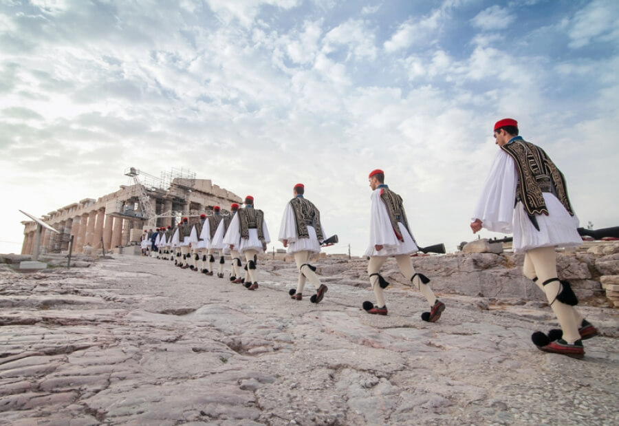 Αθήνα, κέντρο. Κυριακή, 8 η ώρα το πρωί. Η πόλη ήσυχη και ήρεμη. Το μόνο που ακούγεται είναι τα τσαρούχια, καθώς το άγημα των Ευζώνων ανεβαίνει στην Ακρόπολη για την έπαρση της σημαίας. Μετά ακούγεται η μπάντα με τον Εθνικό Ύμνο και ο ήχος από τον κρίκο της ελληνικής σημαίας να χτυπά στον σιδερένιο ιστό, καθώς ανεβαίνει. «Είναι ένα συναίσθημα πάρα πολύ δύσκολο να περιγραφεί, πάρα πολύ ιδιαίτερο και για τους ίδιους Εύζωνες, αλλά και για μένα. Τούς ακολούθησα ξανά, τουλάχιστον 35 φορές», λέει στο ΑΠΕ-ΜΠΕ η φωτογράφος Δήμητρα Χατζηαδάμ, καθώς θυμάμαι την πρώτη και όσες ακόμη φορές ακολούθησε το άγημα των Ευζώνων, που ανέβαινε στην Ακρόπολη για την έπαρση της ελληνικής σημαίας.