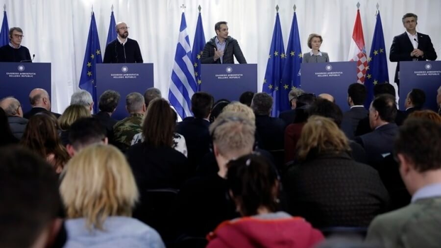 «Η Ευρώπη μέχρι σήμερα απέτυχε να βρει κοινή λύση σε αυτό το σύνθετο πρόβλημα. Κάποιοι βολεύτηκαν να κλείσουν τα μάτια και να αφήσουν τα κράτη που βρίσκονται στα εξωτερικά σύνορα να αντιμετωπίσουν μόνα τους αυτή τη διαρκή κρίση. Η παρουσία των επικεφαλής των ευρωπαϊκών θεσμών είναι η καλύτερη απόδειξη ότι αυτό αλλάζει», είπε ο κ. Μητσοτάκης, ο οποίος ευχαρίστησε τους Ευρωπαίους ηγέτες για τη συμπαράσταση τους, εκφράζοντας τη σιγουριά ότι αυτή θα γίνει πιο έμπρακτη.