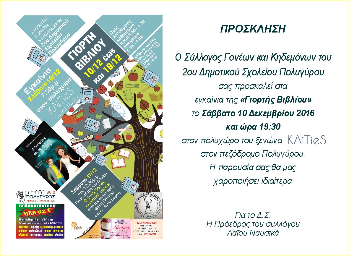 Γιορτή Βιβλίου οργανώνει ο Σύλλογος Γονέων και Κηδεμόνων του 2ου Δημοτικού Σχολείου Πολυγύρου το διάστημα 10 – 19 Δεκεμβρίου 2016. Χιλιάδες τίτλοι βιβλίων περιμένουν μικρούς και μεγάλους βιβλιοφάγους στον πεζόδρομο, στον πολυχώρο του ξενώνα KΛiTieS.