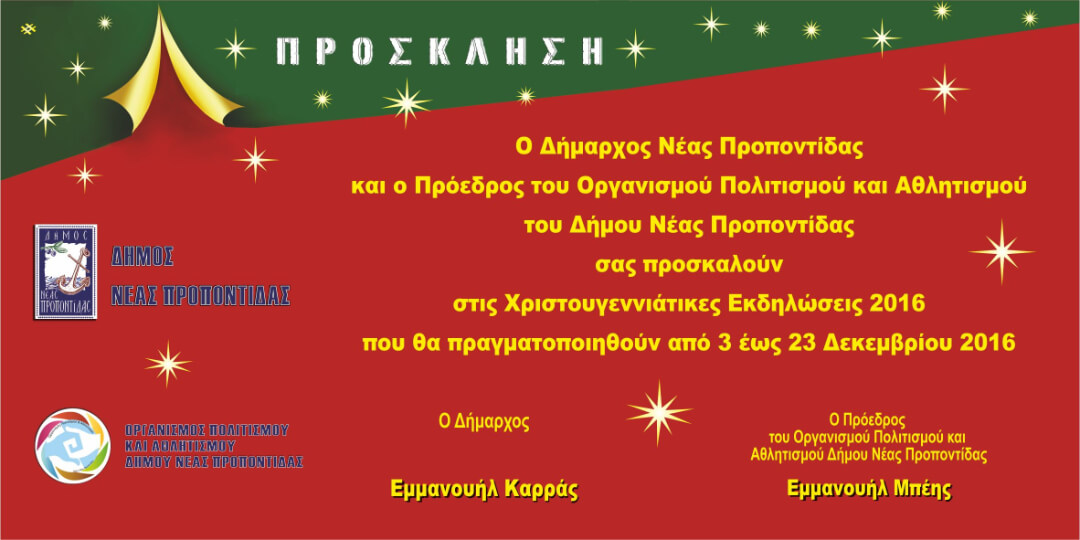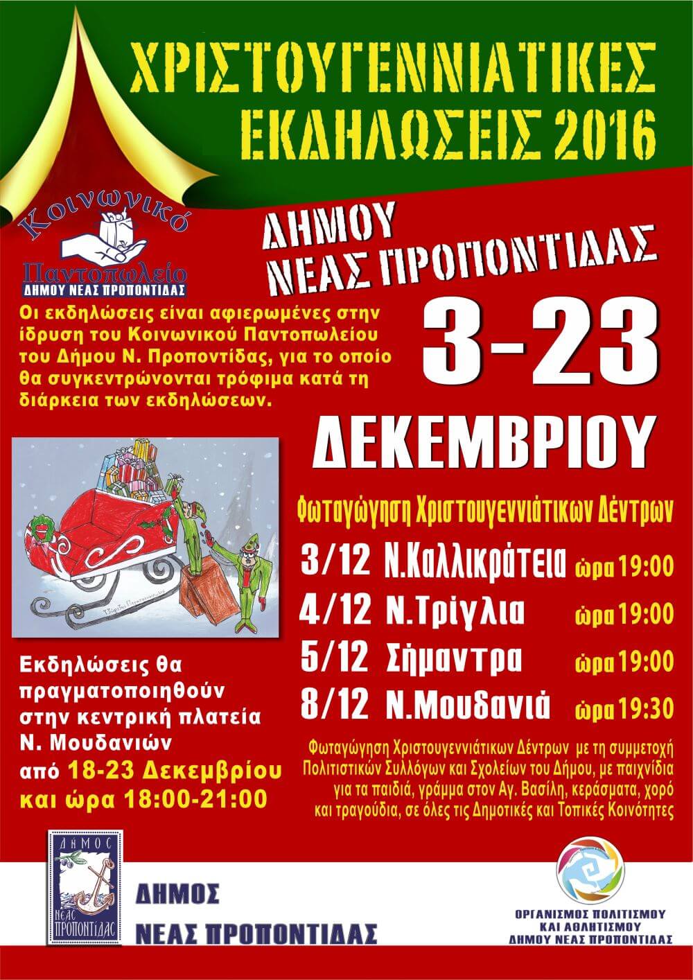 Στο πλαίσιο των Χριστουγεννιάτικων εκδηλώσεων του Δήμου Νέας Προποντίδας και του Οργανισμού Πολιτισμού και Αθλητισμού Δήμου Νέας Προποντίδας, σας ενημερώνoυμε για το εβδομαδιαίο πρόγραμμα των εκδηλώσεων που θα λάβουν χώρα στις Δημοτικές και Τοπικές Κοινότητες του Δήμου Νέας Προποντίδας από 3 Δεκεμβρίου έως και τις 13 Δεκεμβρίου 2016.