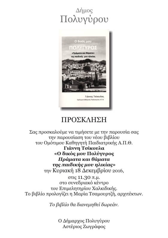 Το νέο του βιβλίο θα παρουσιάσει ο Ομότιμος Καθηγητής Παιδιατρικής ΑΠΘ, Ιωάννης Τσίκουλας, με τίτλο «Ο δικός μου Πολύγυρος. Πράματα και θάματα της παιδικής μου ηλικίας», στο Συνεδριακό Κέντρο του Επιμελητηρίου Χαλκιδικής, την Κυριακή 18 Δεκεμβρίου 2016, στις 11.30 το πρωί.