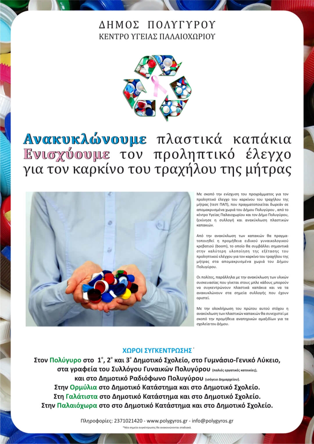 Με σκοπό την ενίσχυση του προγράμματος για τον προληπτικό έλεγχο του καρκίνου του τραχήλου της μήτρας (τεστ ΠΑΠ), που πραγματοποιείται δωρεάν σε απομακρυσμένα χωριά του Δήμου Πολυγύρου από το κέντρο Υγείας Παλαιοχωρίου και τον Δήμο Πολυγύρου, ξεκίνησε η συλλογή και ανακύκλωση πλαστικών καπακιών.