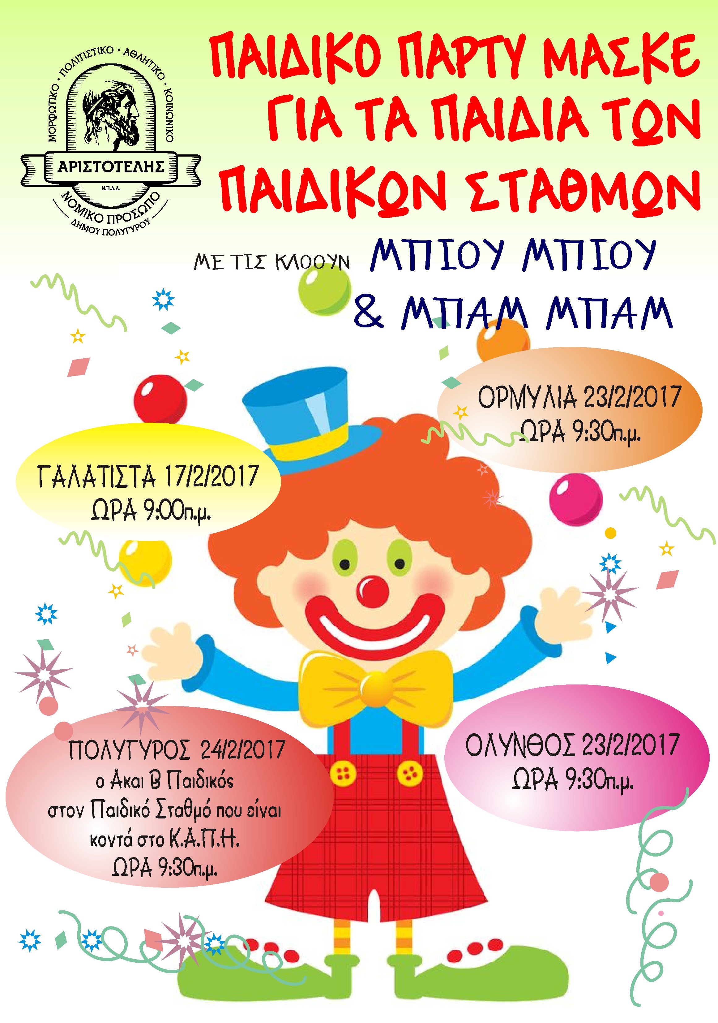 Το Μορφωτικό – Πολιτιστικό - Αθλητικό και Κοινωνικό Νομικό Πρόσωπο του Δήμου Πολυγύρου «ΑΡΙΣΤΟΤΕΛΗΣ» στα πλαίσια του εκπαιδευτικού προγράμματός, οργανώνει αποκριάτικες εκδηλώσεις,
