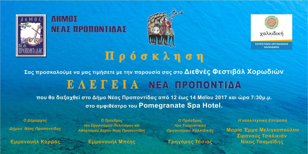 Ο Δήμος Νέας Προποντίδας και ο Τουριστικός Οργανισμός Χαλκιδικής πραγματοποιούν το 1ο Διεθνές Φεστιβάλ Χορωδιών ‘Ελεγεία - Νέα Προποντίδα’ που θα διεξαχθεί στο Δήμο Νέας Προποντίδας από 12 έως 14 Μαΐου 2017 και ώρα 19:30 στο αμφιθέατρο του Pomegranate Spa Hotel.