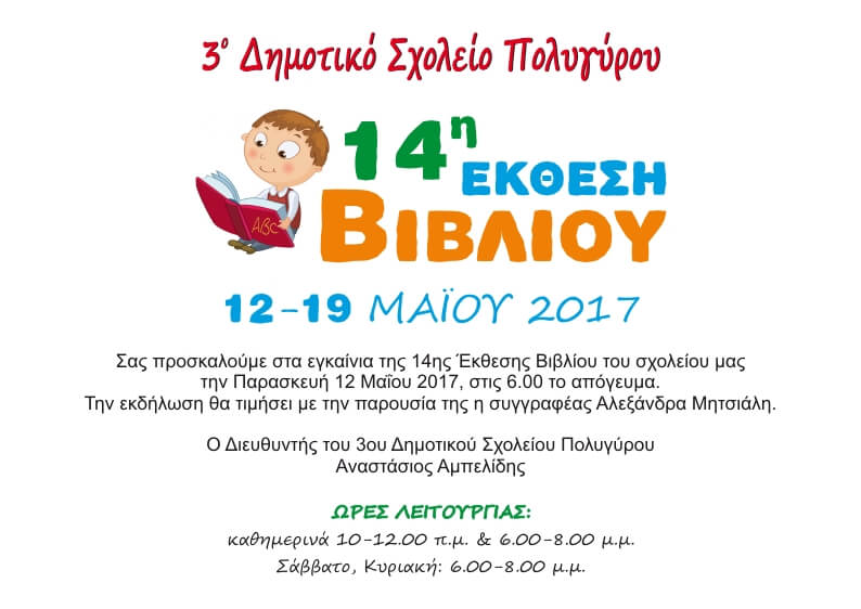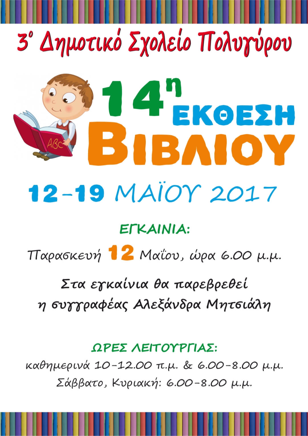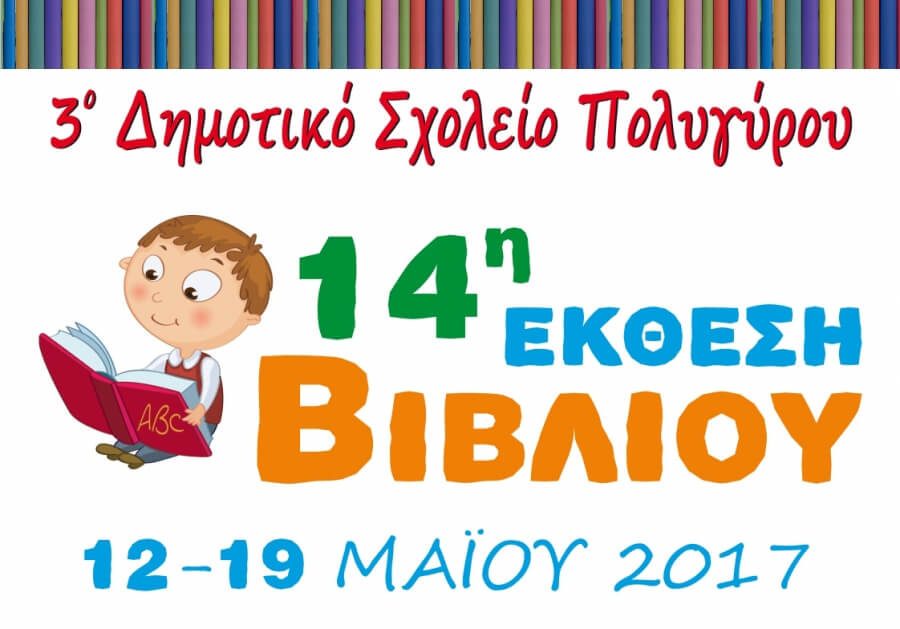 Ο Σύλλογος Γονέων & Κηδεμόνων και ο Σύλλογος Διδασκόντων του 3ου Δημοτικού Σχολείου Πολυγύρου διοργανώνουν την 14η Έκθεση Βιβλίου από 12 έως 19 Μαΐου 2017.