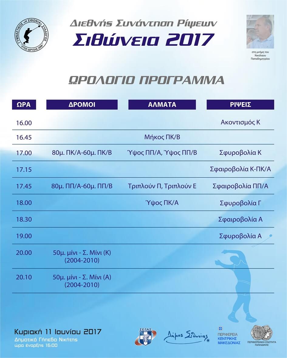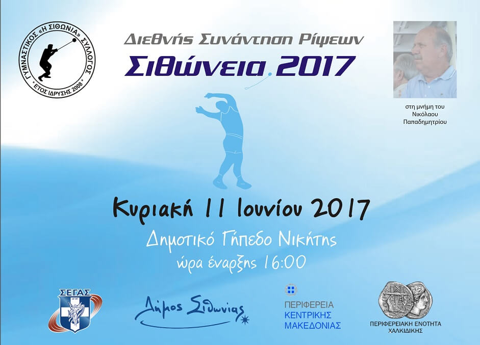 Η 16η διεθνής συνάντηση ρίψεων “Σιθώνεια” θα διεξαχθεί την Κυριακή 11 Ιουνίου 2017 και ώρα 16:00, στο Δημοτικό Γήπεδο Νικήτης.
