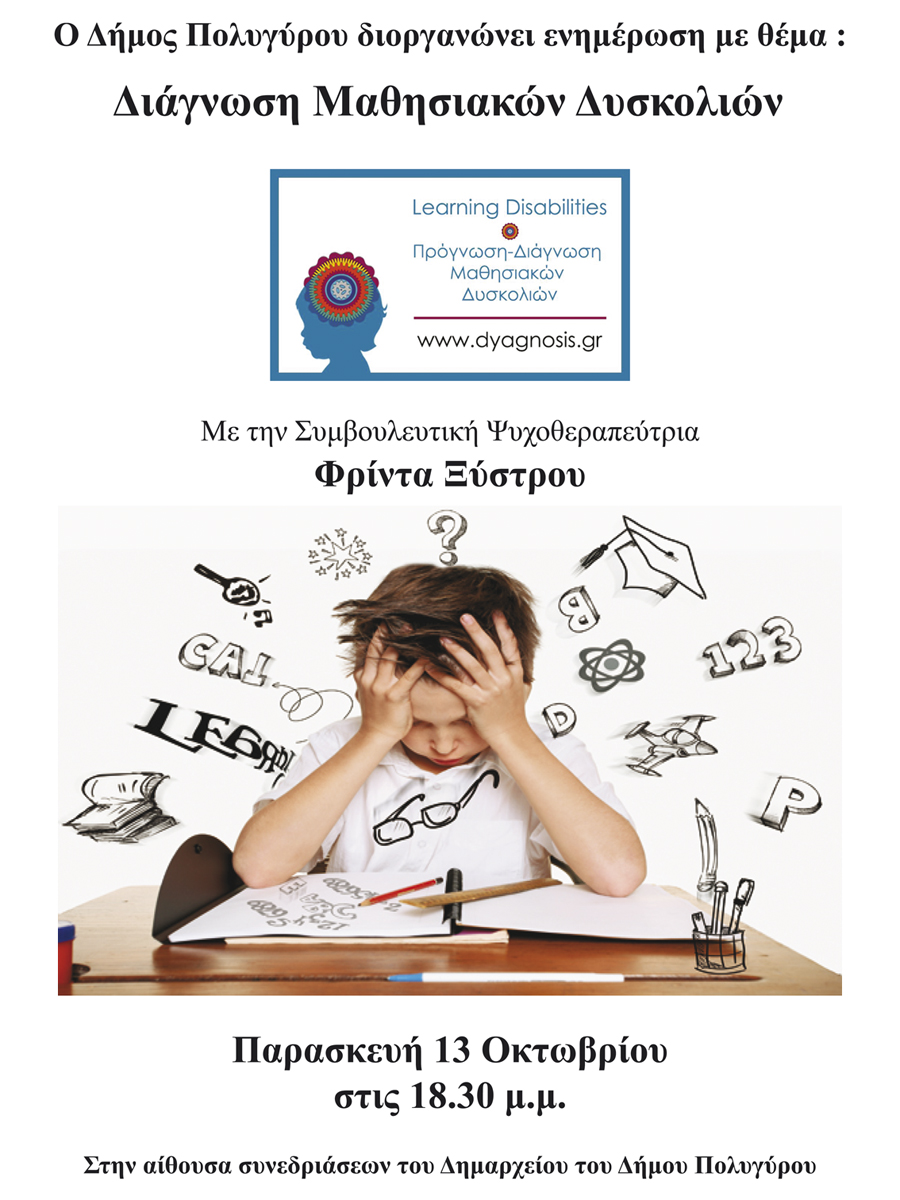 Ενημέρωση με θέμα «Διάγνωση Μαθησιακών δυσκολιών» οργανώνει ο Δήμος Πολυγύρου με τη συνεργασία της Συμβουλευτικής Ψυχοθεραπεύτριας, Φρίντας Ξύστρου, την Παρασκευή 13 Οκτωβρίου 2017, στις 18:30, στην αίθουσα συνεδριάσεων του Δημοτικού Συμβουλίου Πολυγύρου, στο Δημαρχείο.