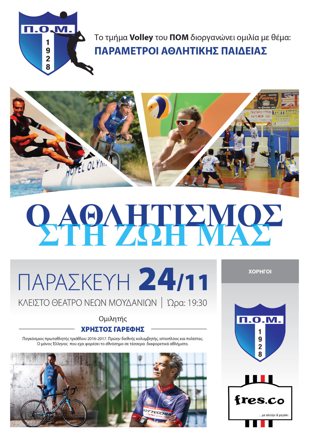 Το τμήμα Volleyball του Π.Ο. Μουδανιών, σε μια προσπάθεια ανάπτυξης και διάδοσης της αθλητικής παιδείας, καλεί γονείς, παιδιά και όλους τους φίλους του αθλητισμού να παρευρεθούν σε μία ξεχωριστή ομιλία του παγκόσμιου πρωταθλητή Τριάθλου, κου Χρήστου Γαρέφη, την Παρασκευή 24/11/2017, στις 19:30 στο Κλειστό Θέατρο Ν. Μουδανιών.