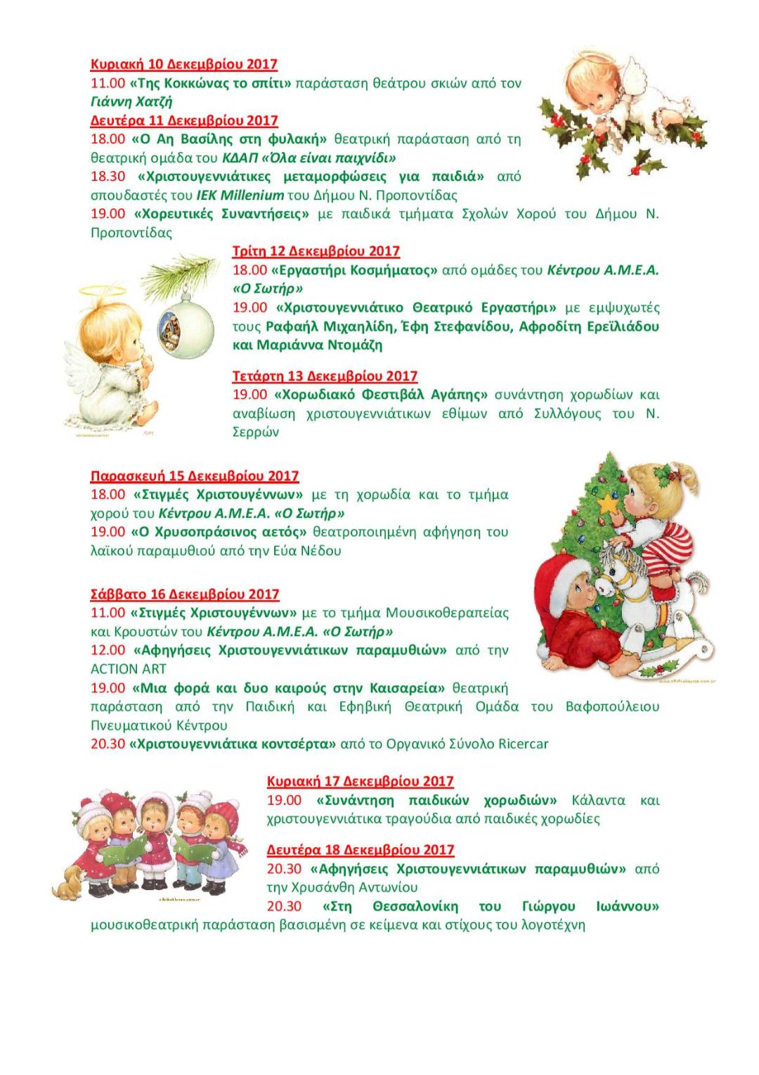 19.00 «Συνάντηση παιδικών χορωδιών» Κάλαντα και χριστουγεννιάτικα τραγούδια από παιδικές χορωδίες, με την συμμετοχή της Παιδικής Χορωδίας του Δημοτικού Ωδείου Νέας Προποντίδας.