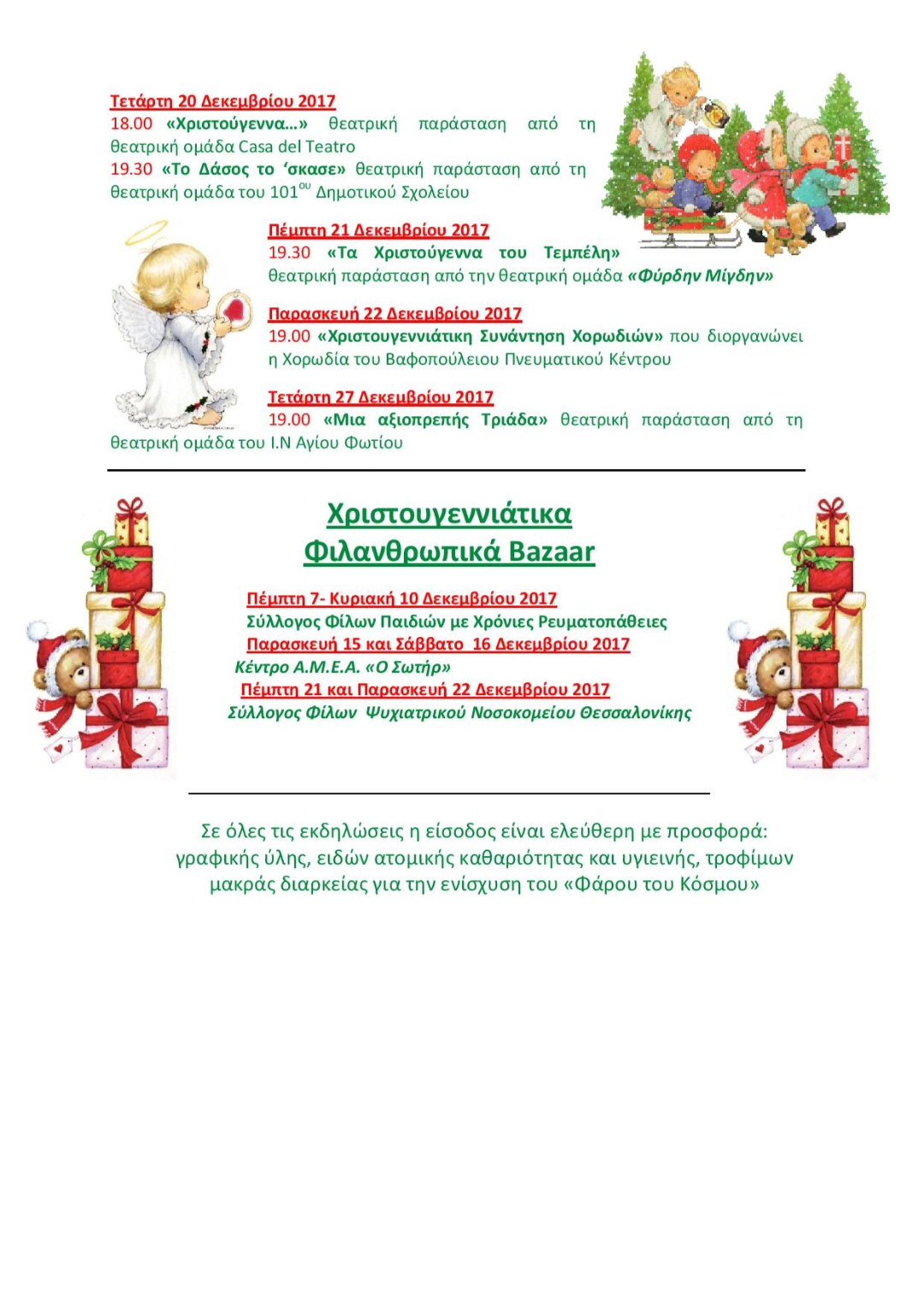 19.00 «Χριστουγεννιάτικη Συνάντηση Χορωδιών» που διοργανώνει η Χορωδία του Βαφοπούλειου Πνευματικού Κέντρου, με την συμμετοχή της Μεικτής Χορωδίας του Πολιτιστικού Συλλόγου Ν.Μουδανιών «Ο ΦΑΡΟΣ».