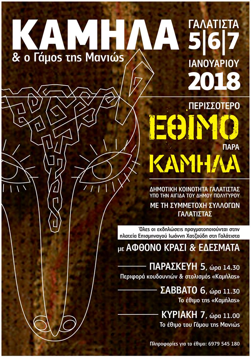 Στη Γαλάτιστα κάθε χρόνο στις 5, 6 και 7 Ιανουαρίου αναβιώνει το έθιμο της «Καμήλας» και του «Γάμου της Μανιώς». Το έθιμο έχει τις ρίζες του στα χρόνια της Τουρκοκρατίας και βασίζεται στο γεγονός της αρπαγής της πεντάμορφης Μανιώς από τον Αγά του χωριού με σκοπό να την κλείσει στο χαρέμι του.