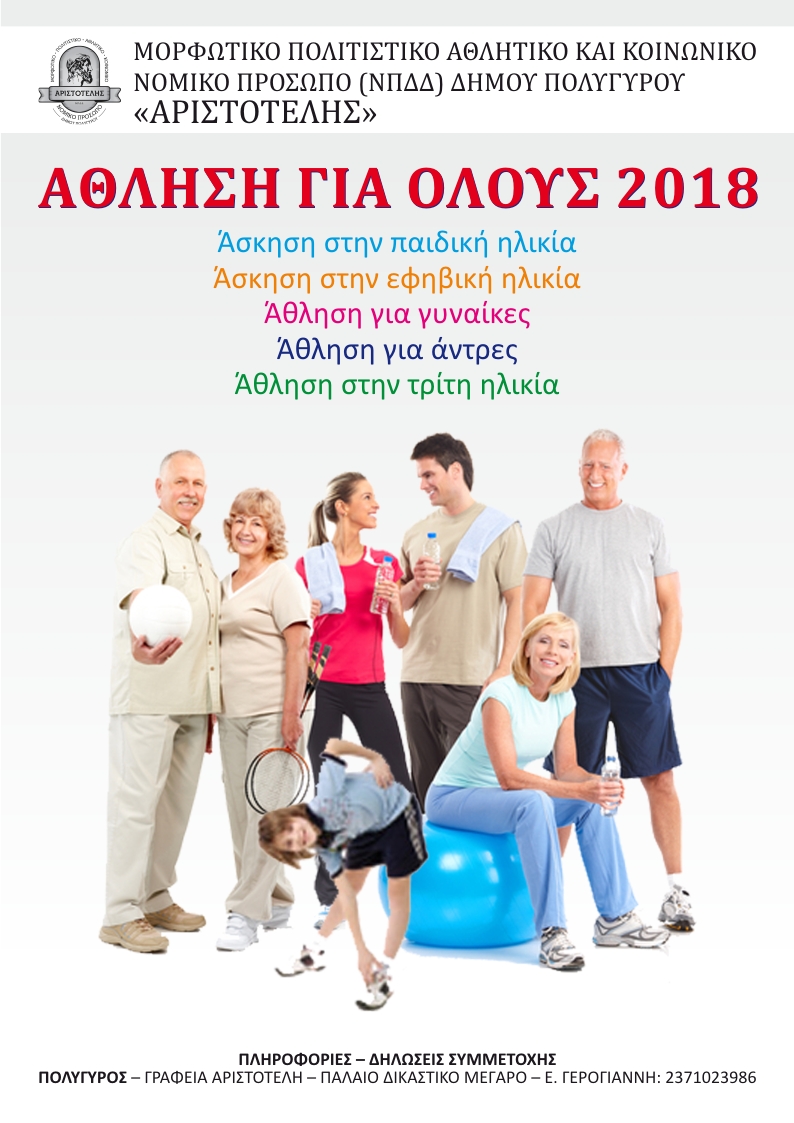 Στις 10 Ιανουαρίου 2018 ξεκινά το πρόγραμμα «Άθληση για Όλους» στον Δήμο Πολυγύρου με διαφορετικά τμήματα, για παιδιά, εφήβους, άνδρες, γυναίκες, για τους αθλούμενους της Γ΄ ηλικίας.
