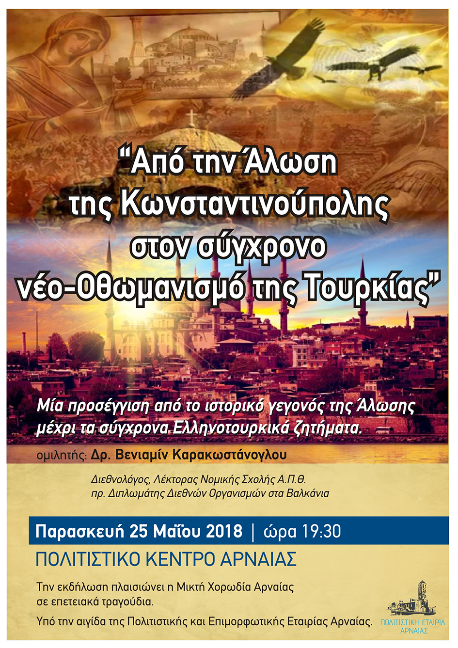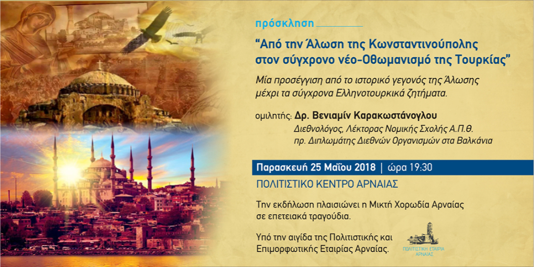 Εισηγητής της εκδήλωσης ο καθηγητής -διεθνολόγος της Νομικής Σχολής του ΑΠΘ και πρ. Διπλωμάτης Βαλκανικών Οργανισμών, κ. Βενιαμίν Καρακωστάνογλου, ο οποίος μας υπόσχεται εντυπωσιακά ιστορικά στοιχεία αλλά και μια ζωντανή ανάλυση των σημερινών γεγονότων.