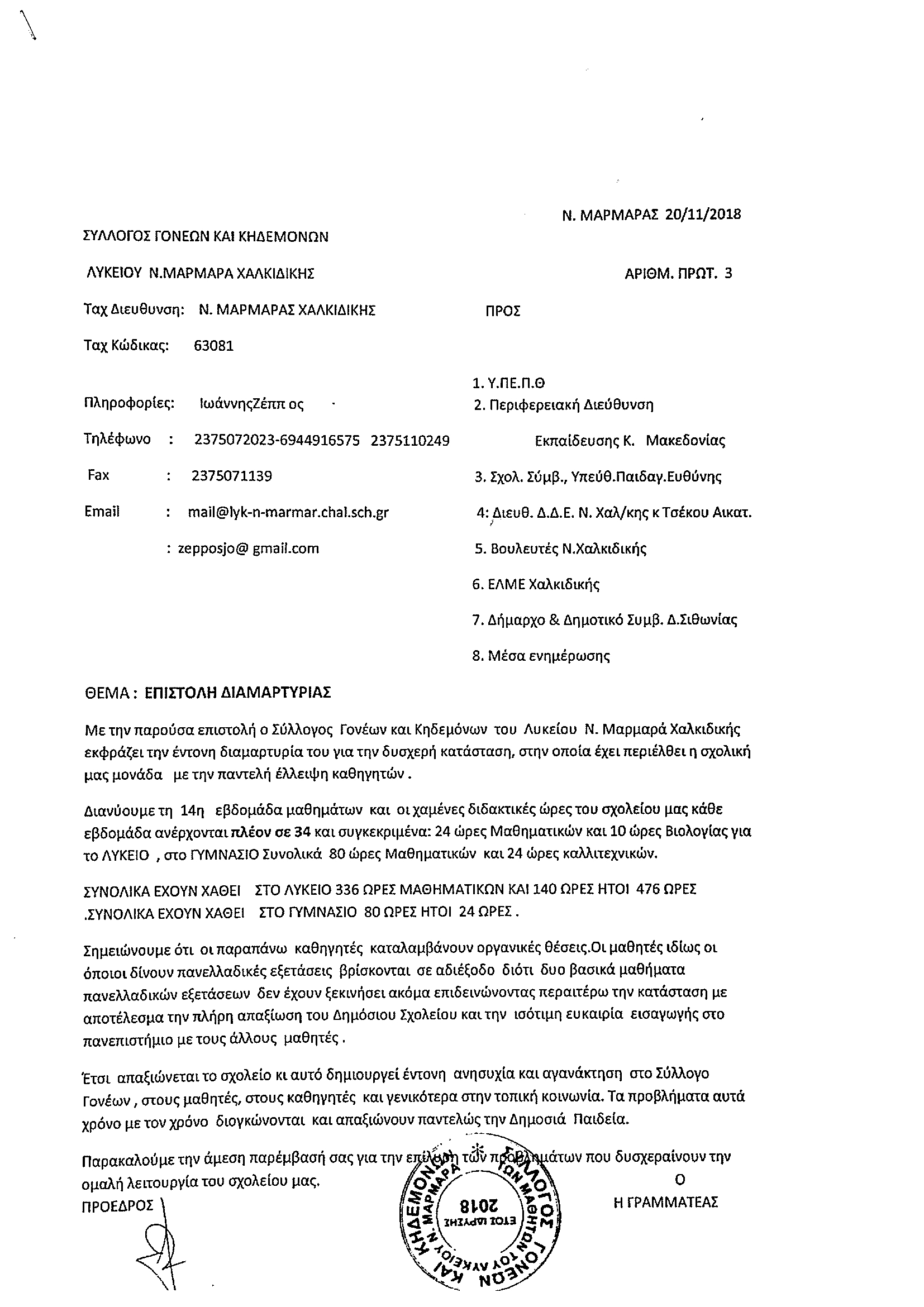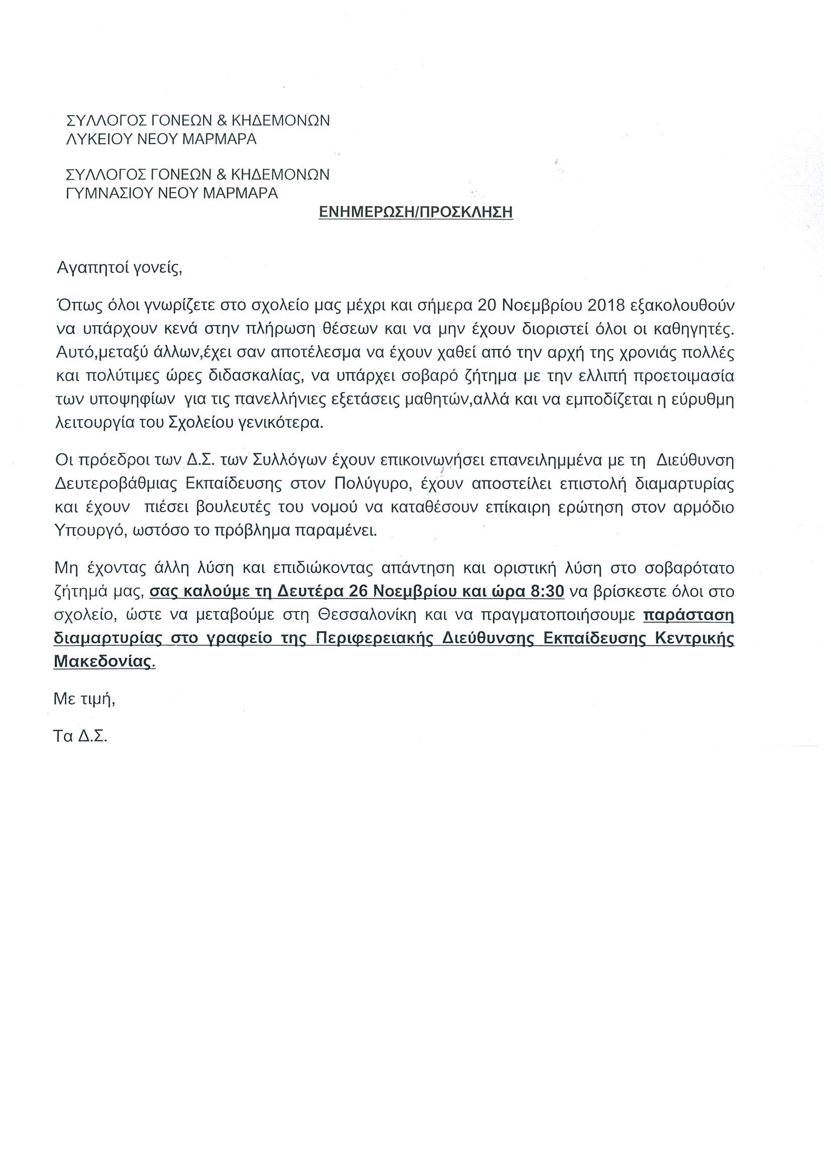 Συνοπτικά αναφέρουν οτι λόγω της μη λύσης του προβλήματος της έλλειψης καθηγητών έπειτα από 15 εβδομάδες του σχολικού έτους προβαίνουν σε ΔΥΝΑΜΙΚΗ παράσταση διαμαρτυρίας την Δευτέρα 26/11 και ώρα 10:30 πμ στο γραφείο της Περιφερειακής Διεύθυνσης Εκπαίδευσης Κεντρικής Μακεδονίας (ΚΤΙΡΙΟ ZEDA) σε μία κοινή προσπάθεια με τους Συλλόγους Γονέων Γυμνασίων και Λυκείων από όλο το νομό Χαλκιδικής (Νέου Μαρμαρά, Συκιάς, Αγίου Νικολάου,Πολυγύρου, Νέων Μουδανίων, Αρναίας, Κασσάνδρας, Ιερισσού, κ.α.) ώστε να δημοσιοποιήθεί αυτό το σοβαρό πρόβλημα.