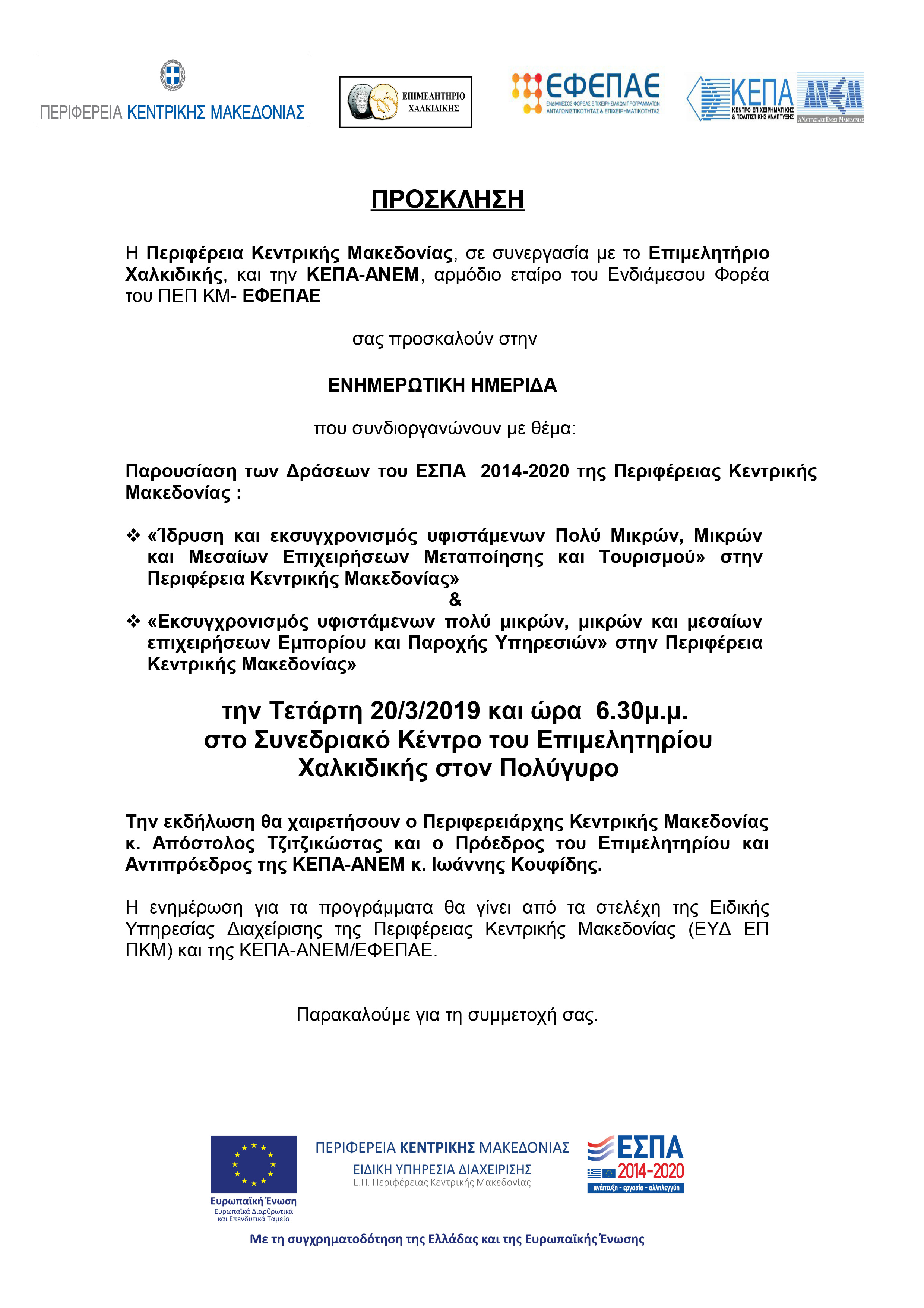 Στο πλαίσιο του σχεδιασμού σειράς ενημερωτικών εκδηλώσεων από την Περιφέρεια Κεντρικής Μακεδονίας και τον ΕΦΕΠΑΕ για την ενημέρωση των Μικρομεσαίων Επιχειρήσεων σχετικά με τις δράσεις ενίσχυσης της Επιχειρηματικότητας στο πλαίσιο του Επιχειρησιακού Προγράμματος της Περιφέρειας Κεντρικής Μακεδονίας (ΕΠ ΠΚΜ) του ΕΣΠΑ 2014-2020, η Περιφέρεια της Κεντρικής Μακεδονίας σε συνεργασία με την ΚΕΠΑ-ΑΝΕΜ (Εταίρος-Περιφερειακή Μονάδα του ΕΦΕΠΑΕ με χωρική και επιχειρησιακή ευθύνη στις Περιφέρειες της Κεντρικής και Δυτικής Μακεδονίας) και το Επιμελητήριο Χαλκιδικής διοργανώνουν