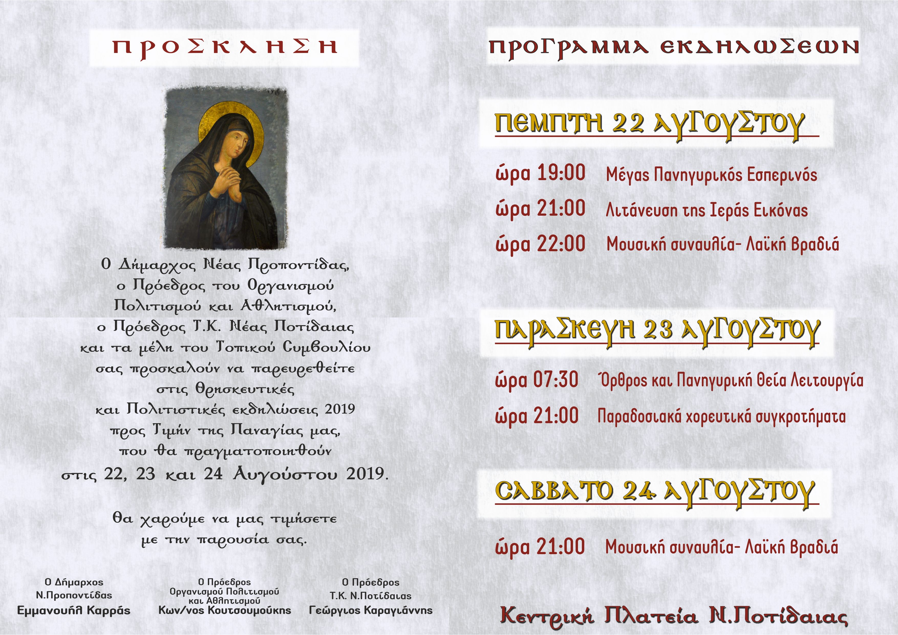 Ο Δήμαρχος Ν. Προποντίδας, ο Πρόεδρος του Οργανισμού, Πολιτισμού και Αθλητισμού, ο Πρόεδρος Τ.Κ. Ν. Ποτίδαιας και τα μέλη του Τοπικού Συμβουλίου σας προσκαλούν να παρευρεθείτε στις θρησκευτικές και Πολιτιστικές εκδηλώσεις 2019 προς Τιμήν της Παναγίας μας, που θα πραγματοποιηθούν στις 22, 23 και 24 Αυγούστου 2019.