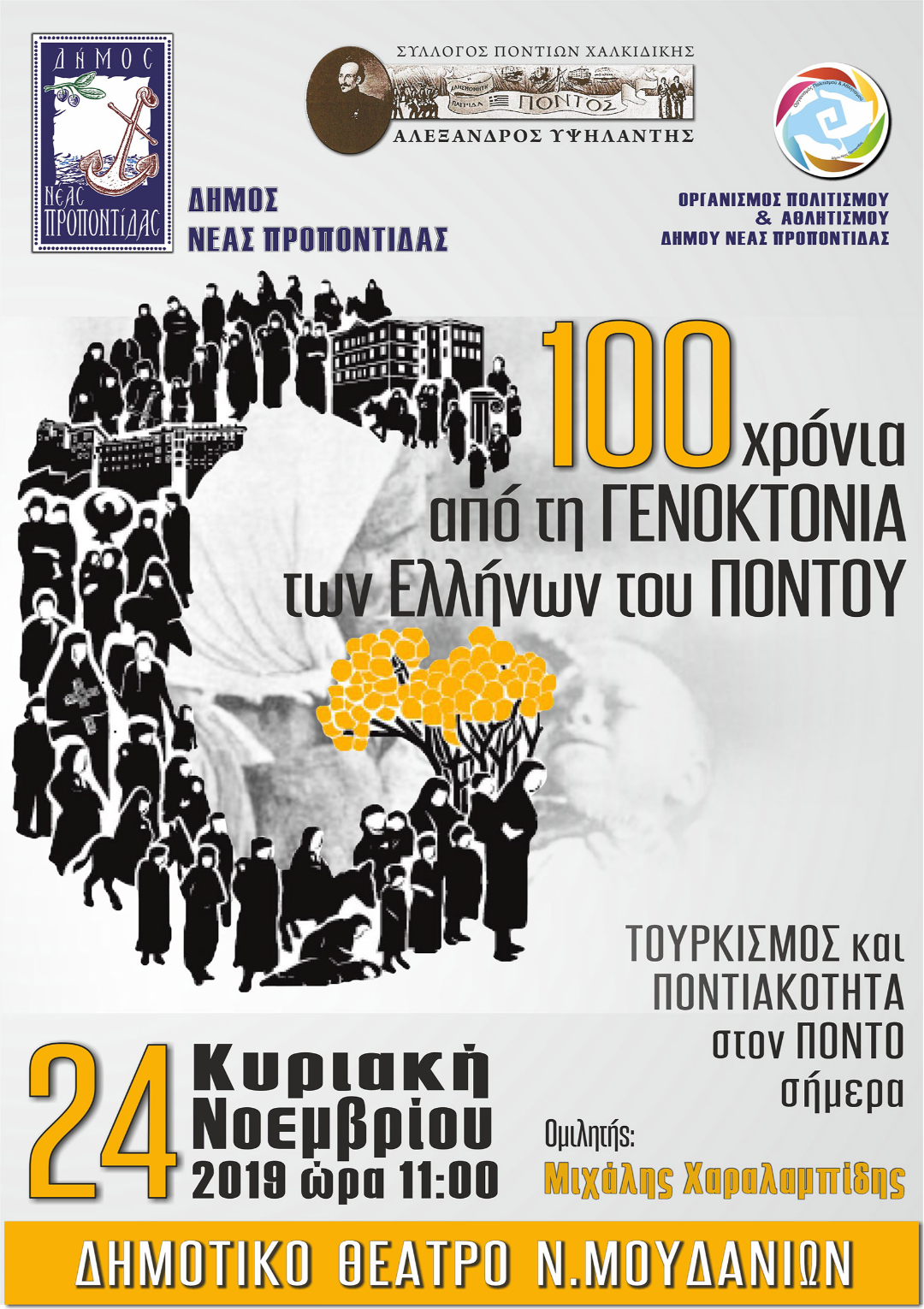 Ο Δήμος Νέας Προποντίδας, ο Οργανισμός Αθλητισμού και Πολιτισμού του Δήμου Ν. Προποντίδας και ο Σύλλογος Ποντίων Χαλκιδικής “Αλέξανδρος Υψηλάντης” συνδιοργανώνουν εκδήλωση με αφορμή τη συμπλήρωση 100 χρόνων από τη Γενοκτονία των Ελλήνων του Πόντου με ομιλητή τον κ. Μιχάλη Χαραλαμπίδη.