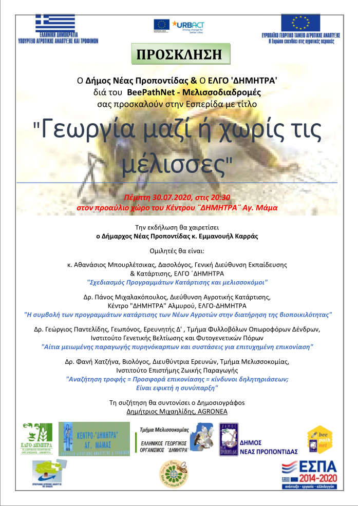Ο Δήμος Νέας Προποντίδας και ο ΕΛΓΟ «Δήμητρα» μέσω του BeePathNet- Μελισσοδιαδρομές διοργανώνουν εσπερίδα με τίτλο «Γεωργία μαζί ή χωρίς τις μέλισσες», η οποία θα πραγματοποιηθεί την Πέμπτη 30/7/2020, στις 20:30 στον προαύλιο χώρο του Κέντρου «Δήμητρα» στον Άγιο Μάμα.