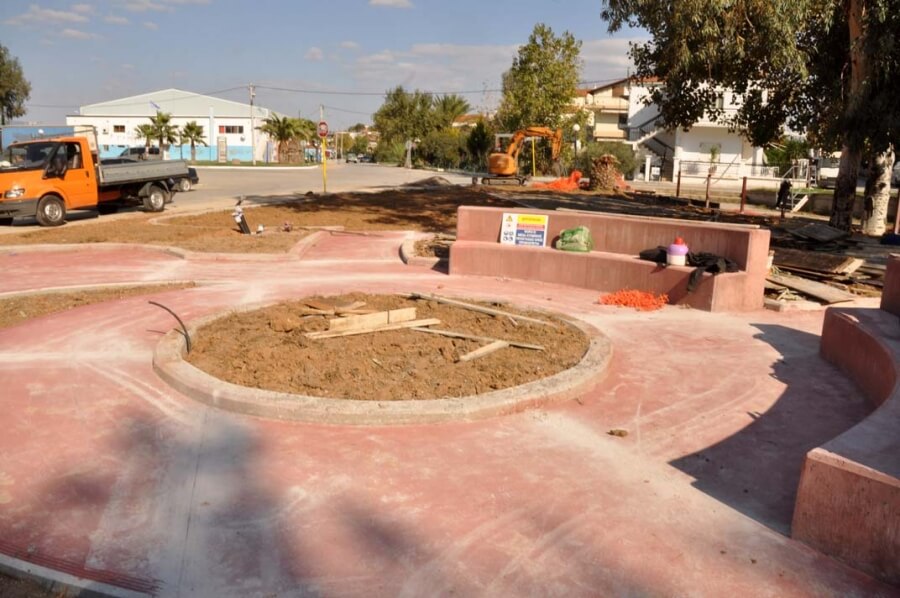 Ο χώρος εσωτερικά της περίφραξης θα διαμορφωθεί με παρτέρια και διαδρόμους. Στο κέντρο της παιδικής χαράς δημιουργήθηκε κεντρικό καθιστικό από έγχρωμο σκυρόδεμα, το οποίο θα συμπληρωθεί με πέργκολα από μέταλλο και ξύλο. Ένας ημικυκλικός διάδρομος θα οδηγεί στη βρύση σχήματος σύννεφου. Κοντά στη βρύση έχουν κατασκευαστεί καθιστικά έγχρωμου σκυροδέματος χωρίς πλάτη σε μικρή απόσταση από τα οποία θα τοποθετηθεί εξαγωνικό κιόσκι. Στους διαδρόμους και μπροστά από κάθε χώρο παιχνιδιού θα τοποθετηθούν παγκάκια. Τα δάπεδα των διαδρόμων και των καθιστικών χώρων είναι από έγχρωμο σκυρόδεμα.