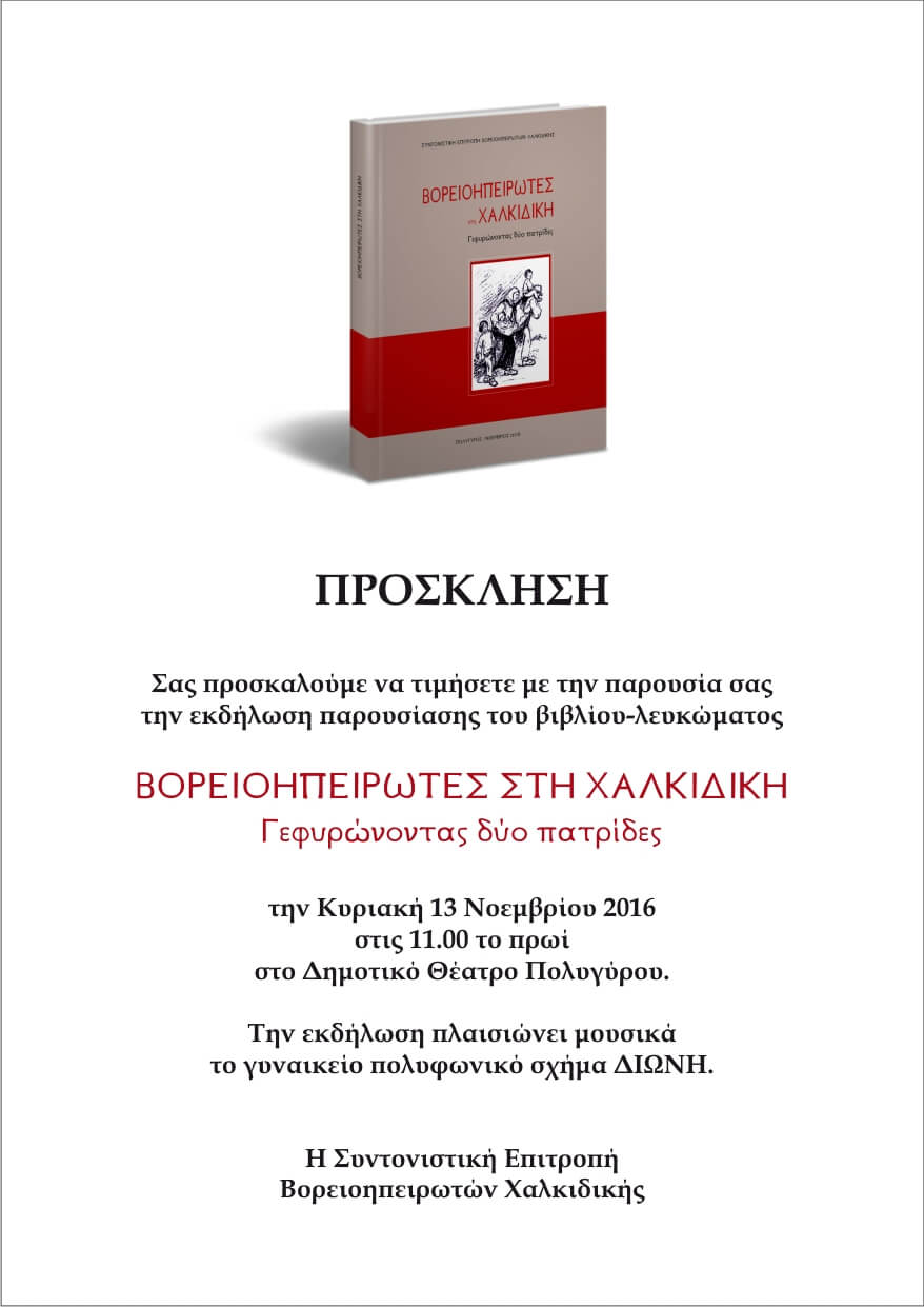 Εκδήλωση για την παρουσίαση του βιβλίου-λευκώματος «Βορειοηπειρώτες στη Χαλκιδική – Γεφυρώνοντας δύο πατρίδες», που εξέδωσε η Συντονιστική Επιτροπή Βορειοηπειρωτών Χαλκιδικής, θα πραγματοποιηθεί την Κυριακή 13 Νοεμβρίου 2016, στις 11.00 το πρωί, στο Δημοτικό Θέατρο Πολυγύρου.