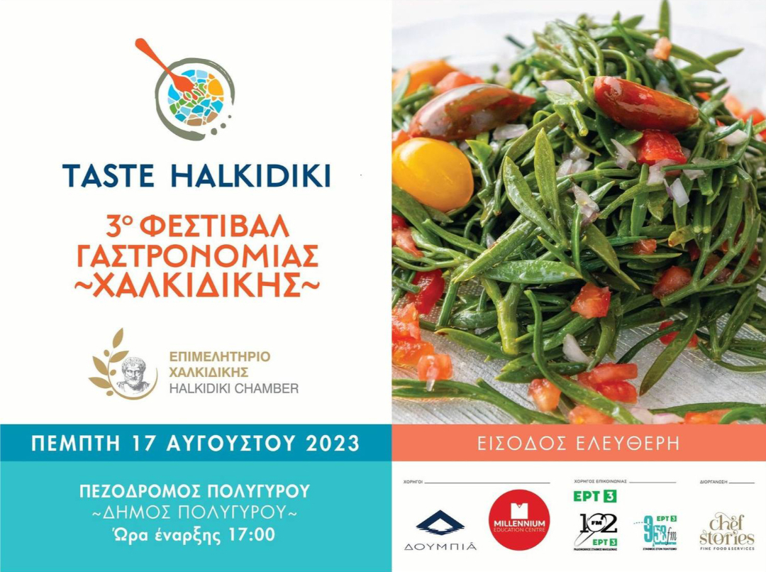 Το Επιμελητήριο Χαλκιδικής ανακοινώνει τη διοργάνωση του 3ου Φεστιβαλ Γαστρονομίας Χαλκιδικής, TASTE HALKIDIKI, που θα πραγματοποιηθεί την Πέμπτη 17 Αυγούστου, ώρα 5 μ.μ. στον πεζόδρομο Πολυγύρου, στο Δήμο Πολυγύρου, στη Χαλκιδική. Η εκδήλωση αποτελεί μέρος των δράσεων TASTE HALKIDIKI, που στόχο έχουν την ανάδειξη του γαστρονομικού πλούτου της περιοχής και είναι μία πρωτοβουλία του προέδρου Γιάννη Κουφίδη και του Δ.Σ. του Επιμελητηρίου Χαλκιδικής, η οποία ξεκίνησε το 2021.