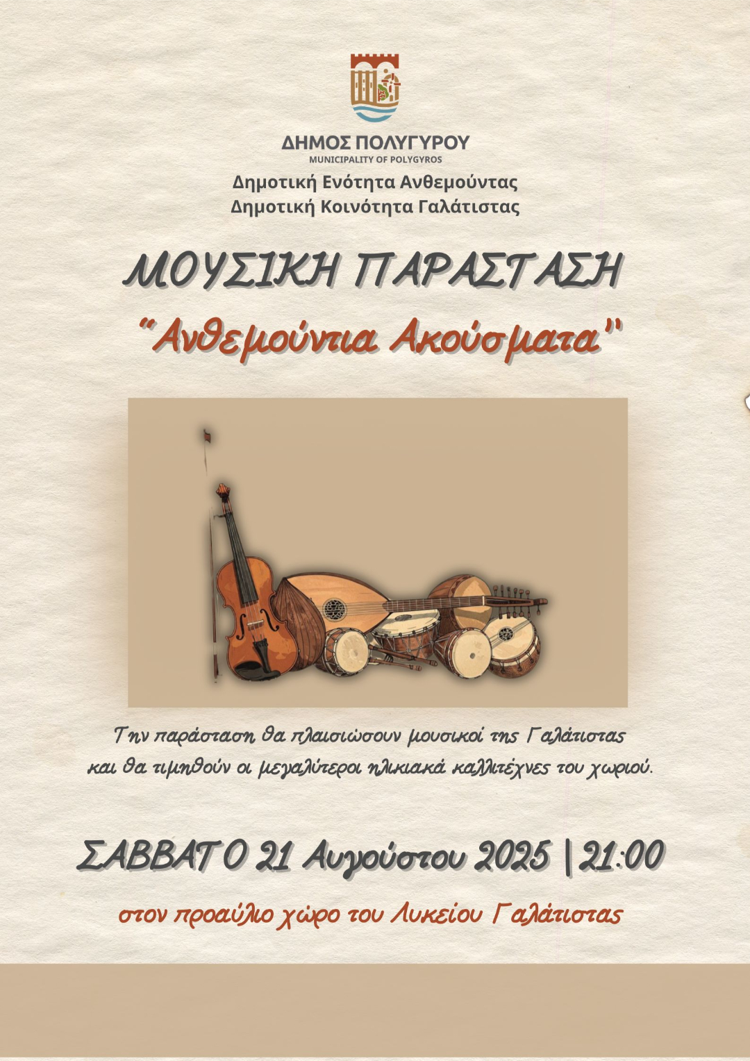 Στον προαύλιο χώρο του Λυκείου θα πραγματοποιηθεί η μουσική παράσταση με τίτλο «Ανθεμούντια Ακούσματα», στην οποία θα συμμετάσχουν μουσικοί από τη Γαλάτιστα. Στο πλαίσιο της βραδιάς θα τιμηθούν οι μεγαλύτεροι ηλικιακά καλλιτέχνες του χωριού, αναγνωρίζοντας τη συμβολή τους στη διατήρηση της τοπικής μουσικής παράδοσης.