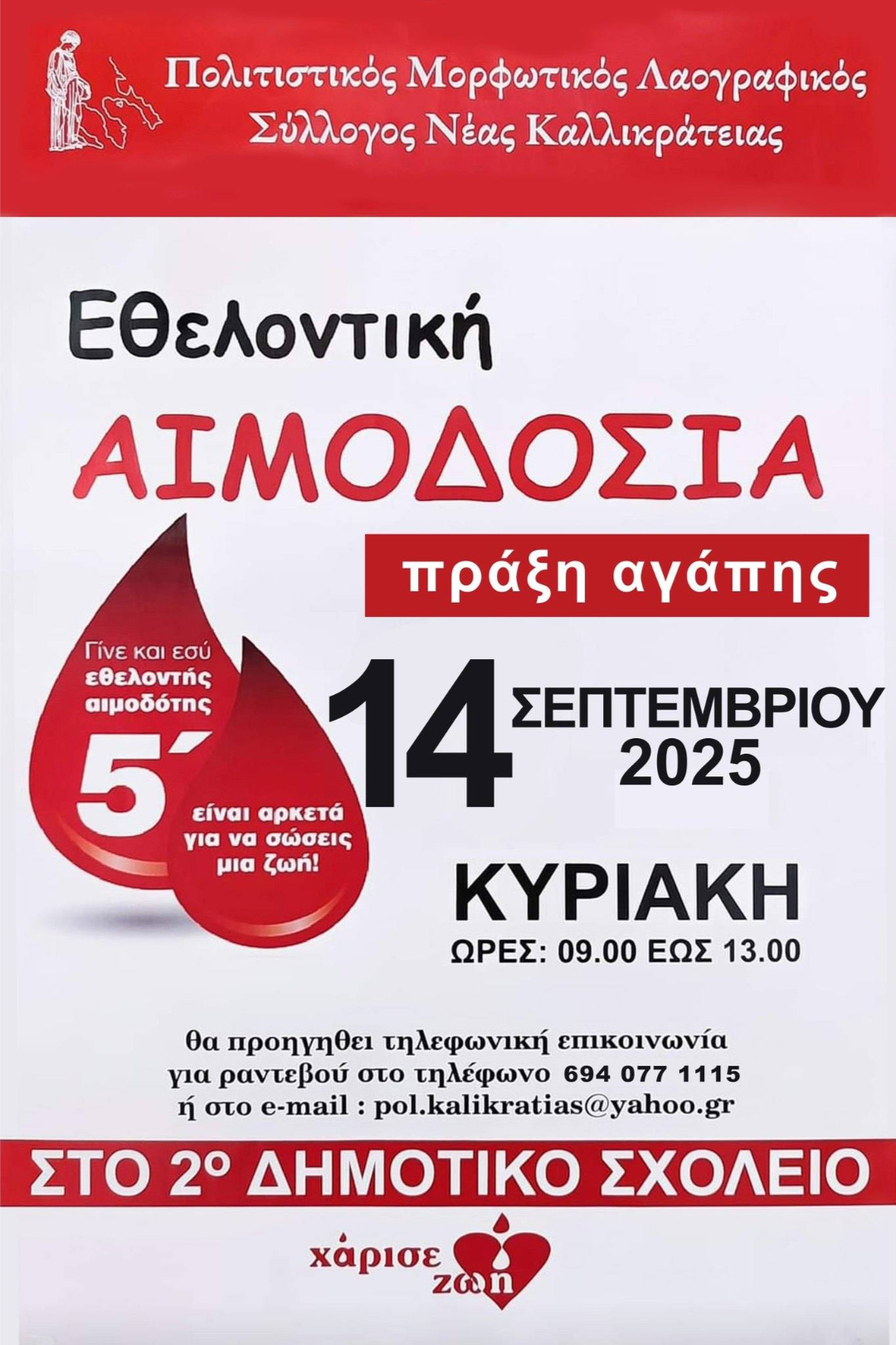 Ο Πολιτιστικός Μορφωτικός Λαογραφικός Σύλλογος Νέας Καλλικράτειας διοργανώνει εθελοντική αιμοδοσία την Κυριακή 14 Σεπτεμβρίου 2025, από τις 09:00 έως τις 13:00, στο 2ο Δημοτικό Σχολείο Νέας Καλλικράτειας.