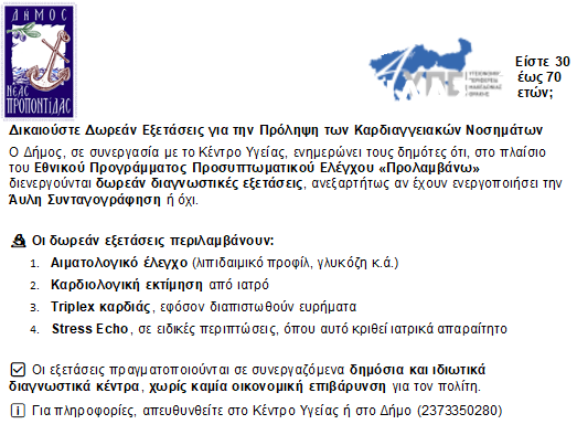 Ο Δήμος Νέας Προποντίδας, σε συνεργασία με το Κέντρο Υγείας Νέων Μουδανιών, ανακοινώνει τη διοργάνωση ενημερωτικών δράσεων για το Εθνικό Πρόγραμμα Προσυπτωματικού Ελέγχου «Προλαμβάνω».