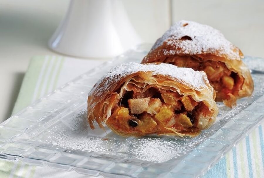Εύκολη, γρήγορη και φρουτένια συνταγή. Τραγανό φύλλο με μελωμένα φρούτα στη μέση. Το μόνο που θέλω να προσέξετε είναι: αν τα φρούτα κατεβάσουν πολλά υγρά προσπαθήστε να μην τα βάλετε επάνω στο φύλλο. Στραγγίξτε τα!
