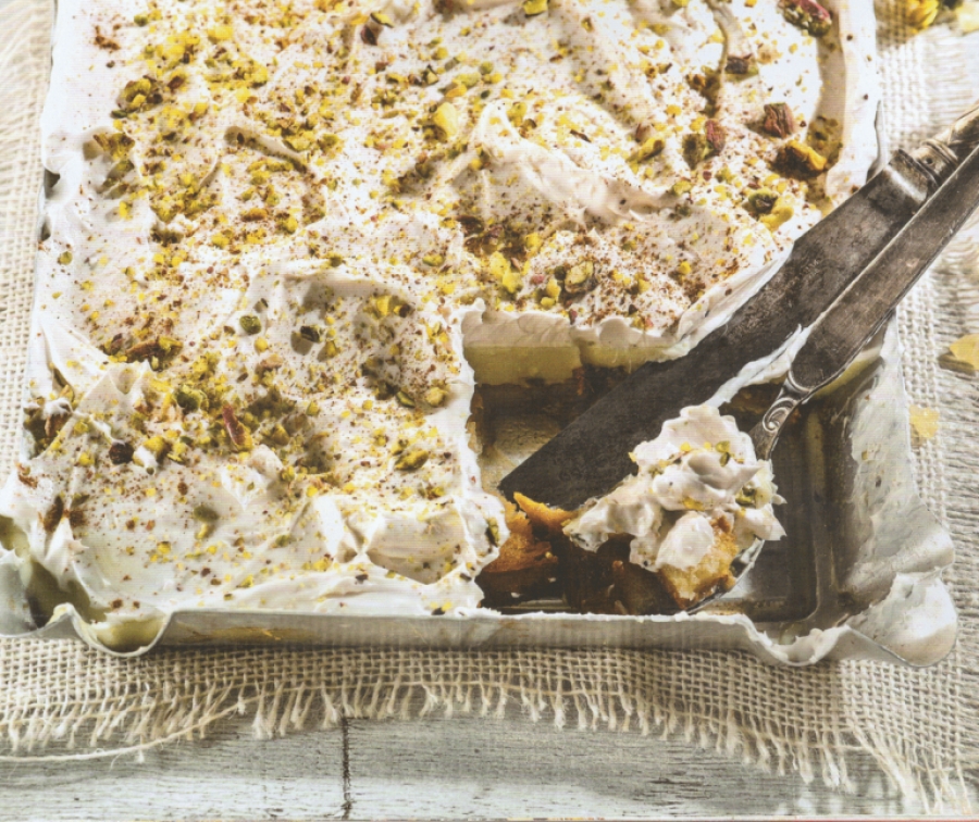Αφήνουμε σε θερμοκρασία δωματίου να κρυώσει. Έπειτα το βάζουμε στο ψυγείο να κρυώσει. Καλύπτουμε με τη σαντιγί. Λίγο πριν σερβίρουμε, πασπαλίζουμε φιστίκια Αιγίνης και κανέλα.[argiro.gr]