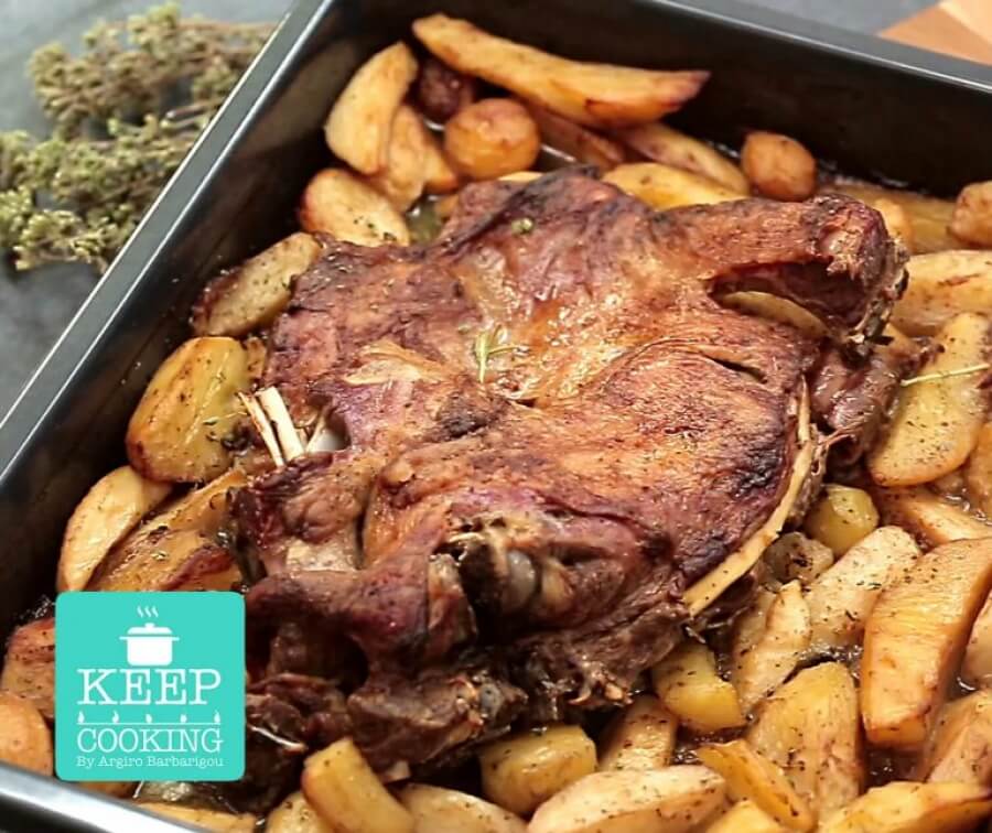 Καλύπτουμε το ταψί, σκεπάζουμε µε λαδόκολλα και αλουμινόχαρτο, κλείνοντας γύρω γύρω το ταψί για να σφραγίσουμε καλά. Ψήνουμε για 1 ώρα στους 200 βαθμούς C. Ξεσκεπάζουμε το ταψί, χαμηλώνουμε το φούρνο στους 180 βαθμούς C και συνεχίζουμε το ψήσιμο για περίπου 1 ώρα και κάτι, μέχρι να ψηθεί το κρέας, να ροδίσει η πέτσα και να μελώσουν οι πατάτες πίνοντας όλα τα υγρά του αρνιού. Στο τέλος πρέπει να μείνει με το λάδι του. [argiro.gr]