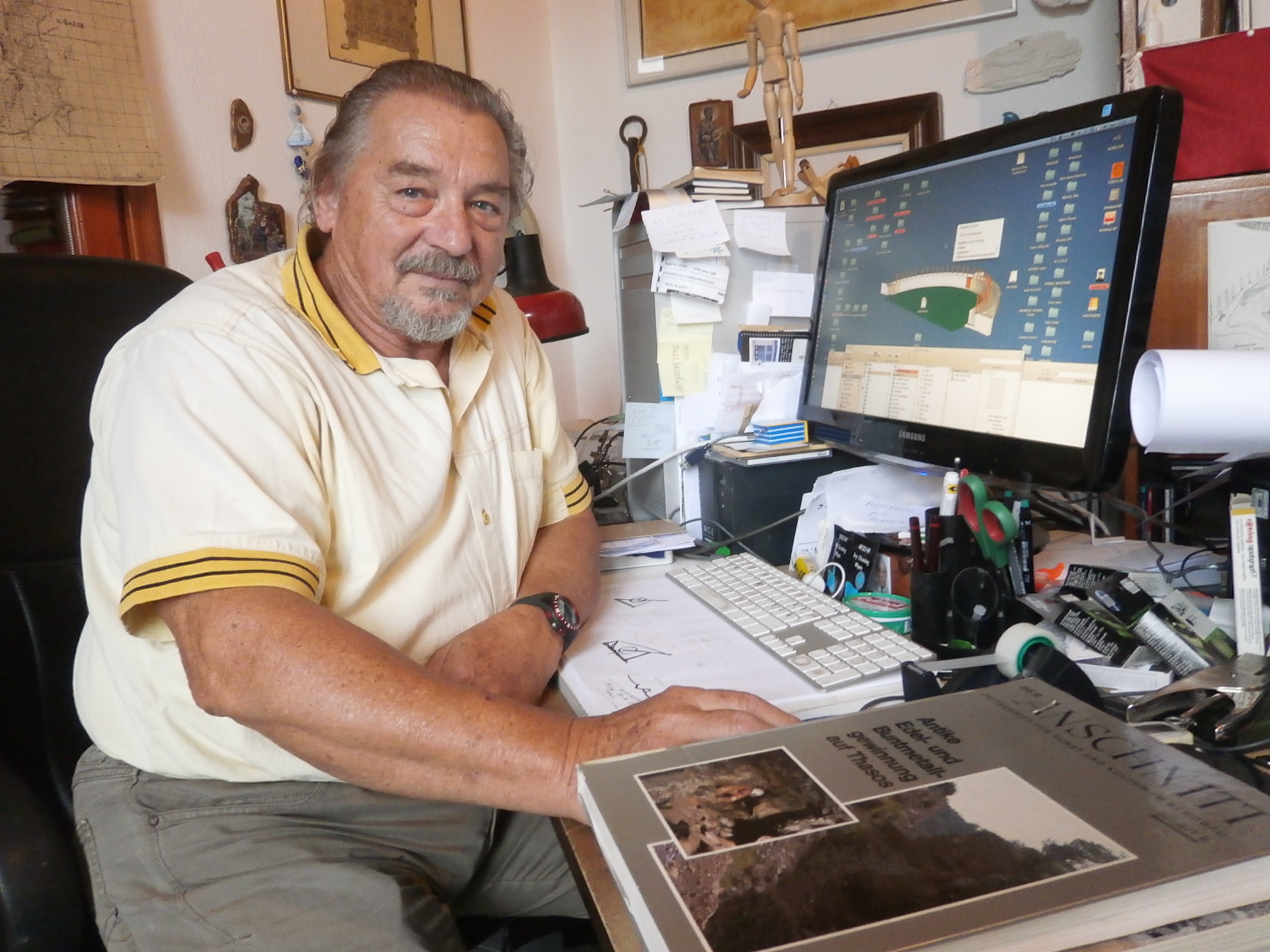 Και οι δυο εργάζονται στη Θάσο για λογαριασμό της Γαλλικής Αρχαιολογικής Σχολής Αθηνών. Στο μικρό και απέριττο νεοκλασικό κτίσμα, όπου στεγάζονται τα γραφεία της Γαλλικής Αρχαιολογικής Σχολής Αθηνών, δίπλα στα ερείπια του αρχαίου ωδείου (στην καρδιά της αρχαίας αγοράς του νησιού, στον Λιμένα), το γραφείο του Tony Kozelj είναι κυριολεκτικά πνιγμένο μέσα σε εκατοντάδες βιβλία, χάρτες, συγγράμματα, τοπογραφικά σχέδια, χειρόγραφα σημειώματα και φωτογραφίες.