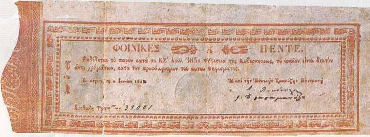 «...χρεωστούντες να εξεύρωμεν τον τρόπον να θεραπεύσωμεν την ανάγκην ταύτην (την έλλειψη χρημάτων) χωρίς να επιφορτίσωμεν με νέους φόρους την γεωργίαν και το εμπόριον, τα οποία πρέπει να αναζωογονήσωμεν ως παθόντα εκ της παρελθούσης ανωμαλίας...», ανακοινώνει ο Καποδίστριας το 1831, αιτιολογώντας την απόφασή του να κυκλοφορήσει χάρτινο φοίνικα. Ο προγραμματισμός είναι να τυπωθεί χαρτονόμισμα συνολικής αξίας 3 εκατ. φοινίκων. Ωστόσο, τυπώνονται αξίας 500.000. Τα πρώτα χαρτονομίσματα των 5, 10, 50 και 100 φοινίκων τυπώνονται στην Αίγινα την 1η Ιουλίου του έτους, αλλά, μη φέροντας την αξία μετάλλου, τόσο οι Έλληνες όσο και οι ξένοι δεν είναι ακόμα έτοιμοι να τα αποδεχθούν στις συναλλαγές τους και δεν κερδίζουν την εμπιστοσύνη.