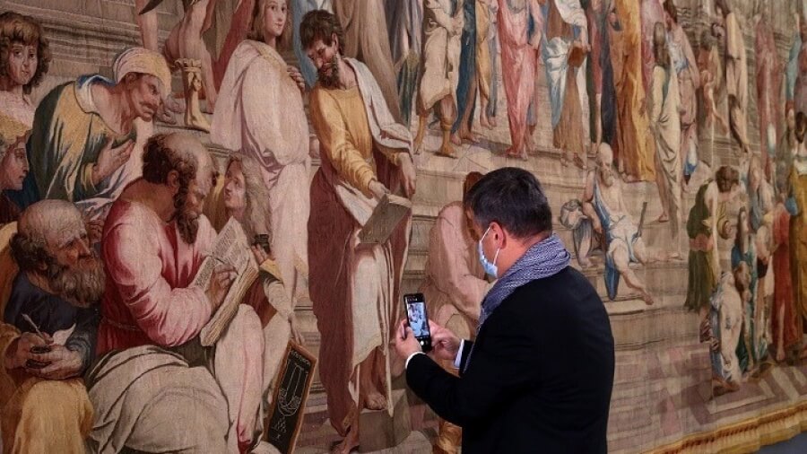 Η διαδικασία ανάρτησης της γιγαντιαίας ταπισερί πραγματοποιήθηκε από τα ειδικά συνεργεία και υπό το άγρυπνο βλέμμα του Γάλλου συντηρητή, Ζεράλντ Ρεμύ.